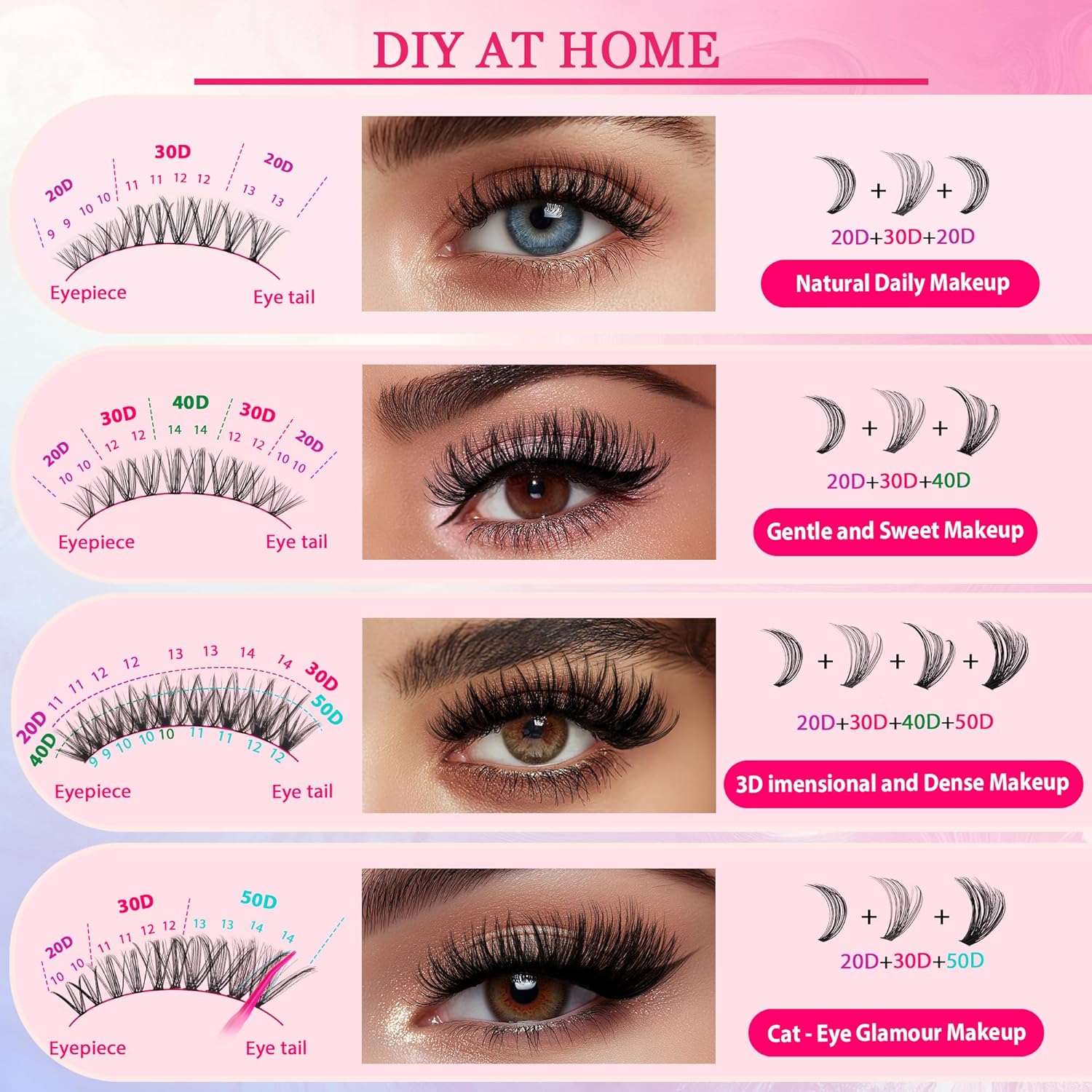 - 【Eternal Classics, Forever Chic】The 20D-50D range dominates salons for decades – proven to flawlessly suit all eye shapes from hooded to monolid, from natural to bold | trendsetting styles.Achieving the perfect eyelash extension look with our diy lash extension kit, customizable to fit any eye shape, you can use different lengths of eyelash clusters to create more style possibilities - cat-eye, fan-eye, doll-eye, dramatic-eye, natural, fluffy, and more.Timeless lash extensions for beginners & pros.