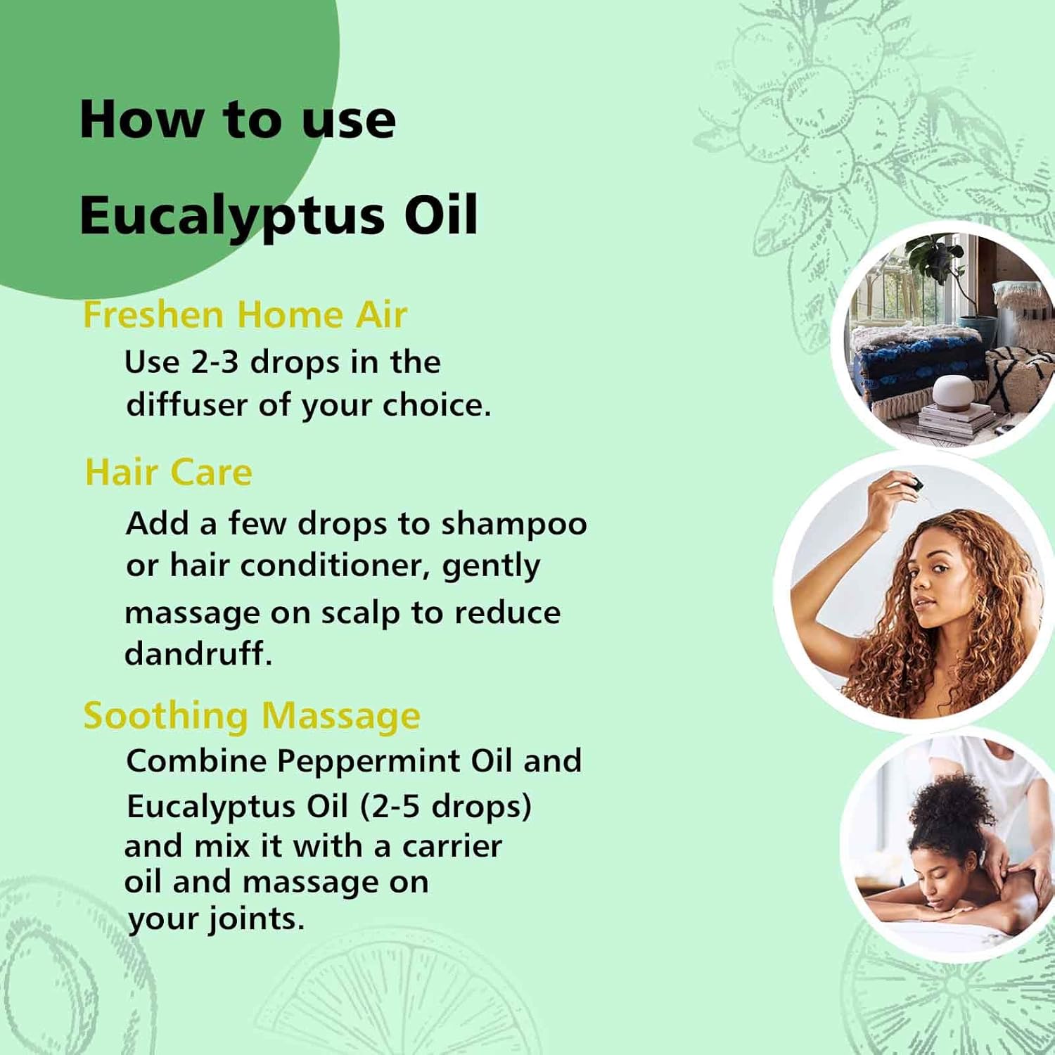 - Refreshing Aroma: Eucalyptus oil carries a clean, invigorating scent that helps create a spa-like atmosphere when used in a diffuser or spray