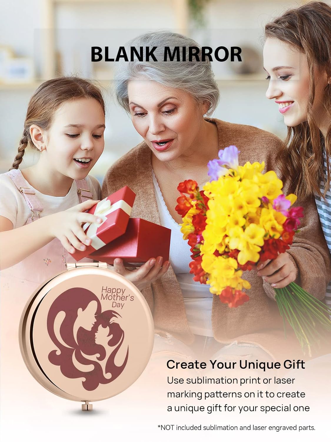 - BLANK MIRROR: DIY friendly. Use sublimation print or laser marking patterns on it to create a unique gift. Customize gifts for your mom, father, daughter, friend, wife, etc., to make them feel special