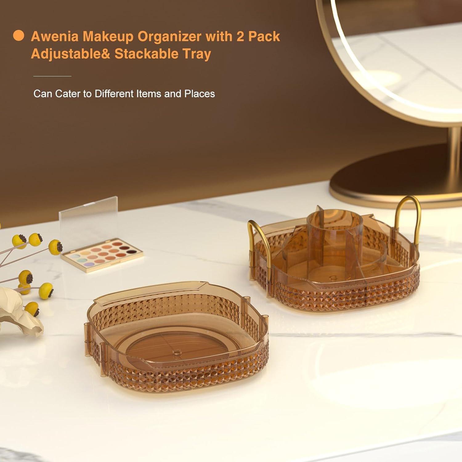 - Stackable &Adjustable:➤The lazy susan organizer is stackable if you get more Awenia clear bathroom countertop organizer and help you save 80% space.With separated top and raise,thicken edges, you can put long brushes,makeup bottle, don’t worry about falling. You can combine three adjustment plates of make up organizers according to your needs.