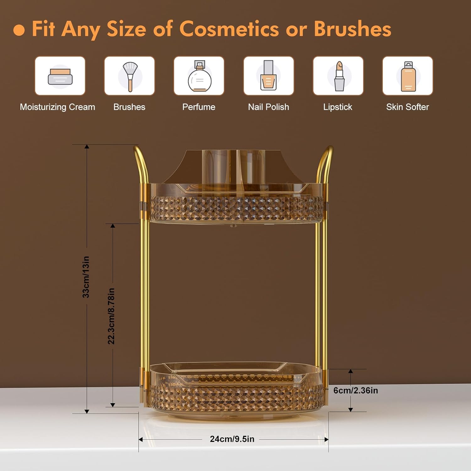 - Washable and Metal Stand:➤Awenia cosmetic organizer with clear acrylic material can be washed or wiped with a damp cloth,cleaned as good as new.Gold stainless steel stand and unique diamond pattern make the perfume organizer more strong,firm beautiful and easy to move. The 360 makeup organizer can be place in Dresser,Bathroom and Kitchen.