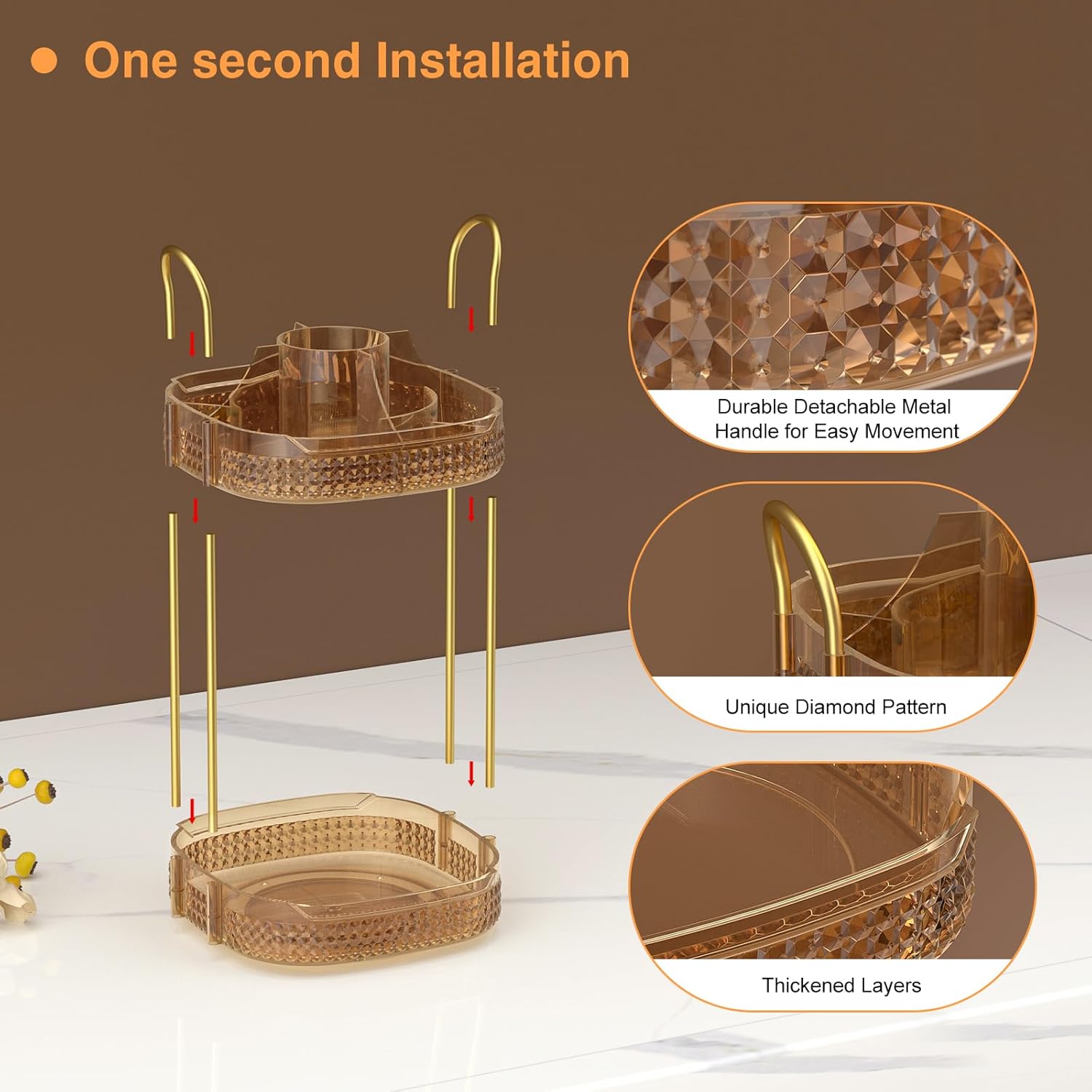 - 360 Degree Rotation& Easy to Install:➤Reinforced steady base rotates smoothly and silently, the rotating makeup organizer is easy access to all of your make-up in seconds.Less installation step are required other than inserting metal rack and handle,do not worry about repeated disassembly to shorten the lifetime of the makeup organizer.