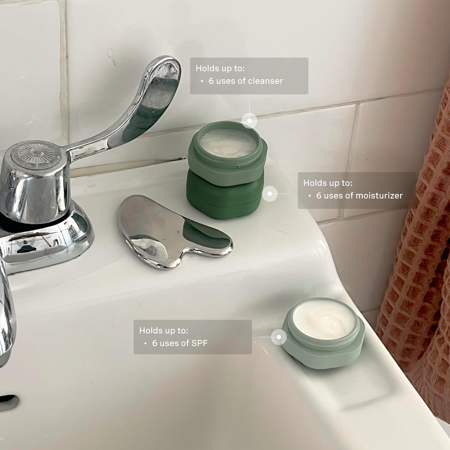 Cadence Travel Containers Basic Skincare Set - Magnetic Containers with Lids,Carry On Travel Essentials For Women/Men - 3 Small Capsules (0.56oz) - Cleanser, Moisturizer & Sun-Icon Labels - Evergreen