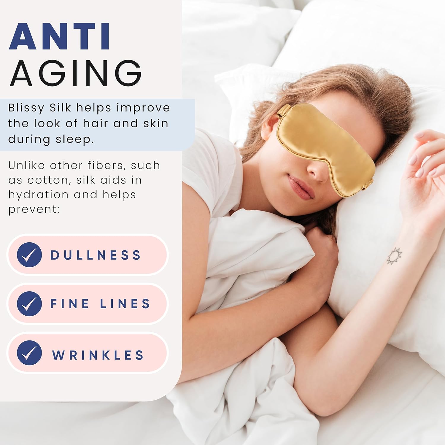 - ANTI-AGING - Blissy Silk helps improve the look of hair and skin during sleep. Unlike other fibers, such as cotton, silk aids in hydration and helps prevent dullness, fine lines, and wrinkles.