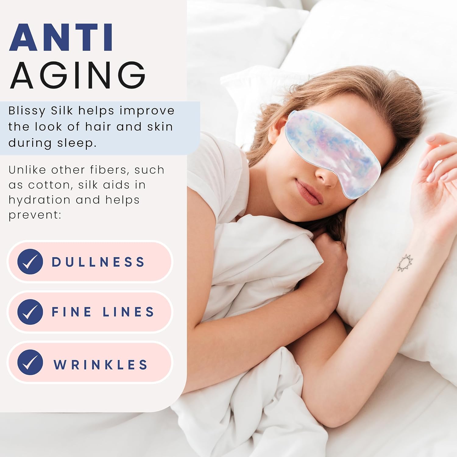 - ANTI-AGING - Blissy Silk helps improve the look of hair and skin during sleep. Unlike other fibers, such as cotton, silk aids in hydration and helps prevent dullness, fine lines, and wrinkles.