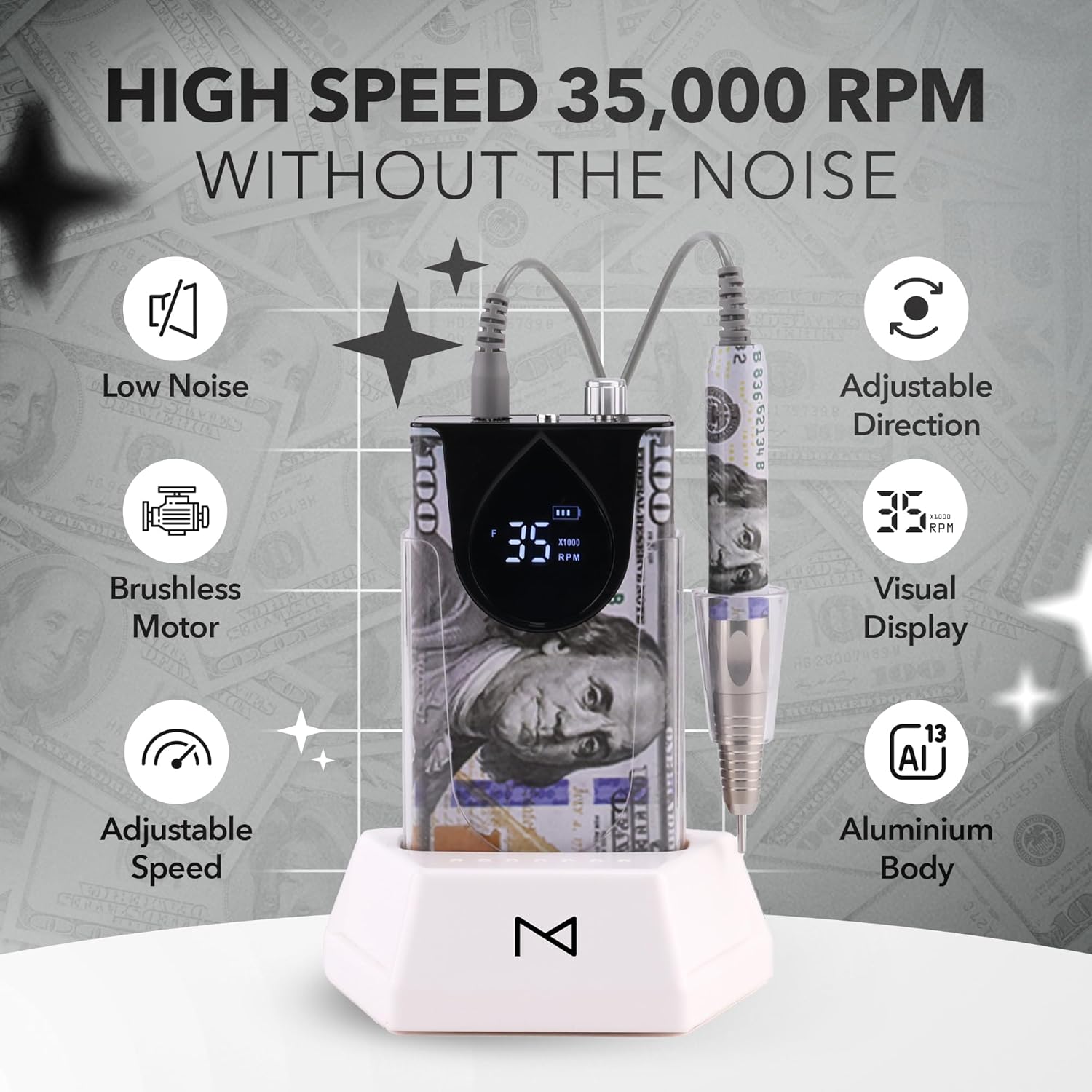 M Max - Nail Drill Professional - 2-in-1 Brushless Motor Nails Drill Machine - Electric, Cordless, Aluminium Alloy Casing, 35000 RPM, HD Display - Perfect for Salon & Home Use Special Edition - Money