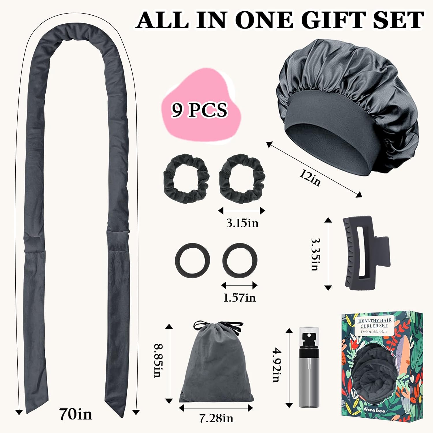 - WOMAN GIFT SET: Our hair curling set includes 9 items: 1 x 70-inch long velvet curling headband, 1 x satin hair bonnet for sleep, 1 x hair clip, 2 x velour hair ties, 2 x elastic hair ties, 1 x velour storage bag, and 1 x spray bottle. This all-in-one curling rods gift set is packaged in an exquisite box, making it the perfect gift for family, friends, and colleagues on various occasions, such as Christmas, New Year's Day, Birthdays, Mother's Day, Valentine's Day, and more