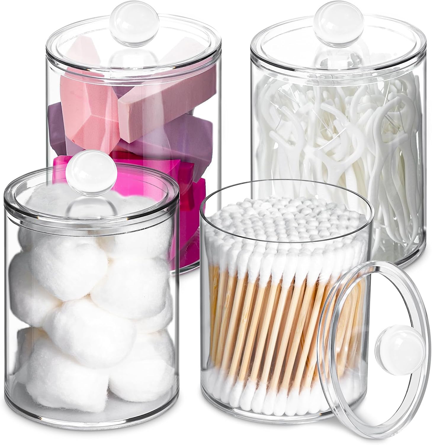 4 Pack Qtip Holder,Canister Apothecary Jar Set, Bathroom Jars with Lids Set for Cotton Swabs, Balls, Pads, Floss Picks,10oz-12oz Plastic Canisters Restroom Bedroom Vanity Organizer