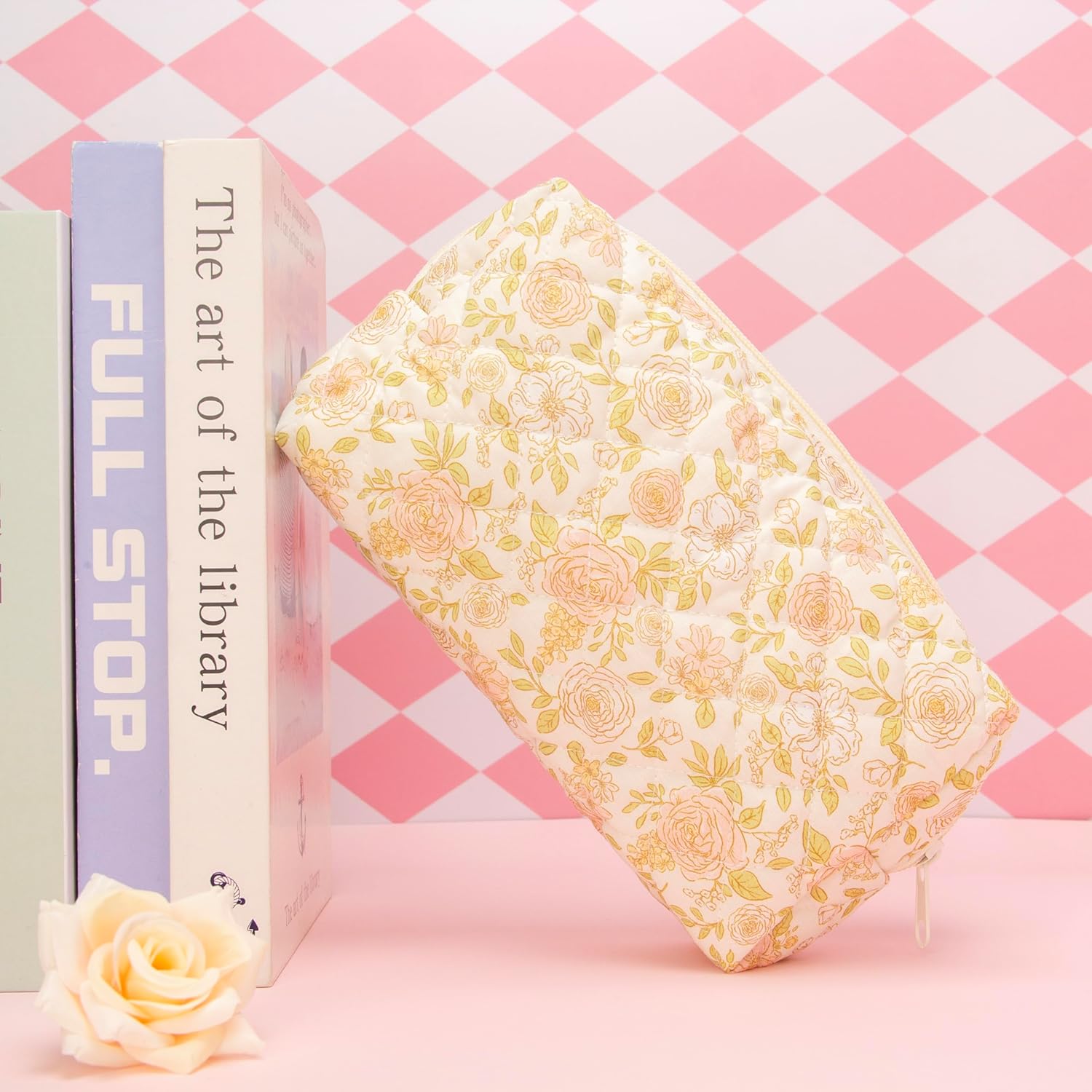 PAZIMIIK Vintage Quilted Makeup Bag Cosmetic Pouch for Brushes Pencils and Travel Make Up Accessories for Women and Girls Rose Beige