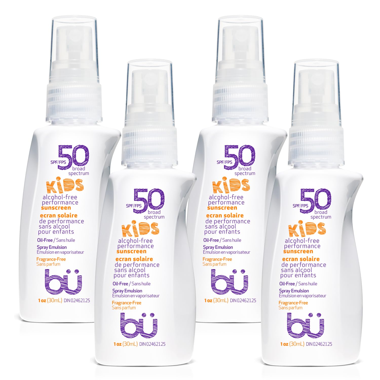 BU SPF 50 Fragrance Free Kids Sunscreen Spray for Face and Body, TSA Travel Size Sunscreen, Clear Non Aeorsol Spray, Non Greasy, Water Resistant and Oil Free, 1 oz (4-pack)
