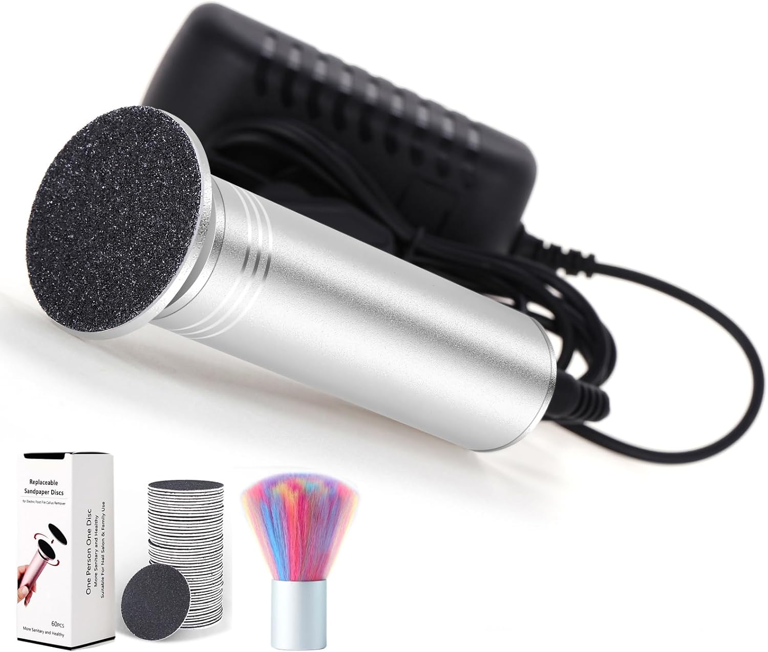 - PACKAGE LIST: 1x Upgraded Electric callus remover-silver, 1x US Plug, 1 Box 60pcs replacement sandpaper discs. 1x User manual, 1x dust brush. Pamper your feet with the convenience of this electric foot file. Its electric callus remover for feet feature makes it an essential tool for achieving salon-like results from the comfort of your home.
