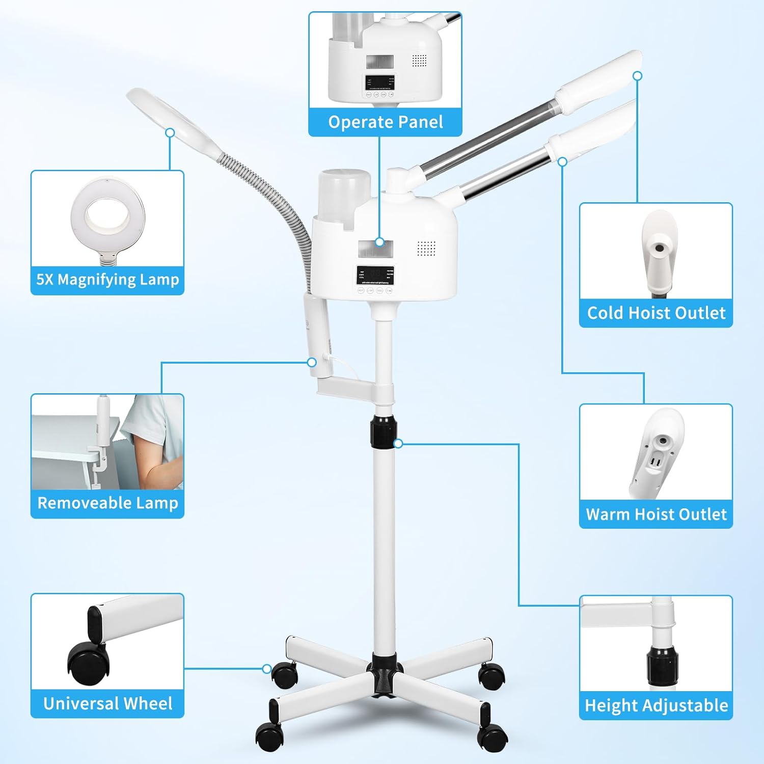 - GREAT QUALITY - Steamer for face spa on wheels,high quality warm stainless steel pipe, sturdy and durable, high capacity water cup, can store 1000ml water, the steamer generates the mist quickly with 1-3mins,the head of the machine is free to rotate 360ยฐ. Adjustable height from 38.1" - 48"