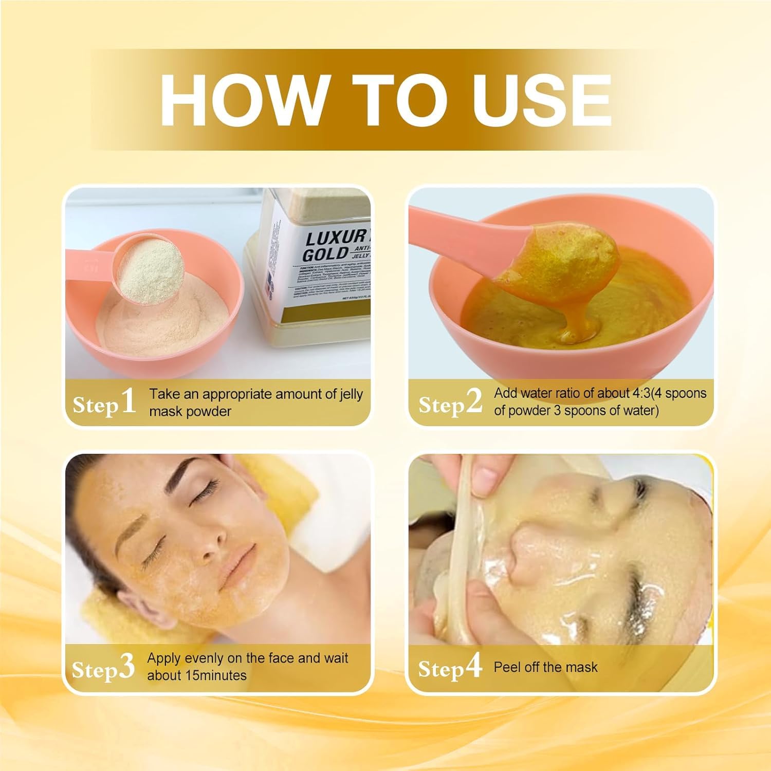 - 【EXPERIENCE PROFESSIONAL SPA AT HOME】 Mix the jelly mask powder and water in the bowl in a 4:3 ratio until combined. If you feel that it is too thin and it will slide down your face, you can add more powder. If you feel that it is too dry to fully absorb, you can add some water. The gel mask for face is fast acting, does not drip, and need 20 minutes of regular use for lasting results. With this peel off hyaluronic acid powder, you can experience a comfortable and undisturbed professional spa experience at home. It is more cost-effective than beauty salons.