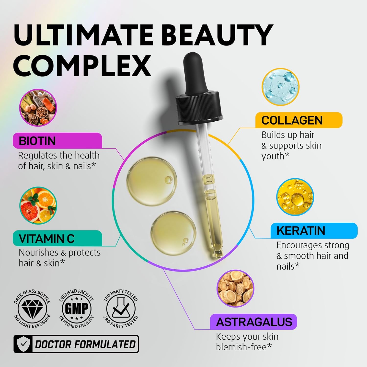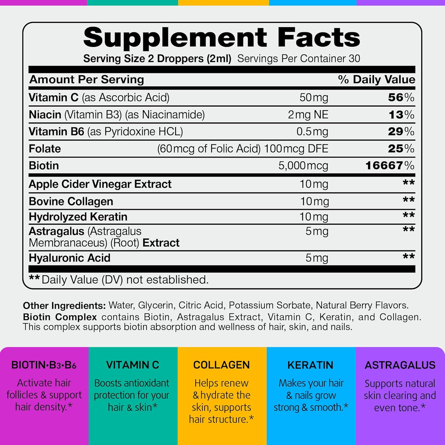 - Powerful Skin Hair and Nails Vitamins for Women & Men – IQ BIOLOGY Biotin Oil is infused with 80,000 mcg of nutrients per serving. This formula includes biotin for thicker hair (biotina para el cabello in Spanish), collagen for skin elasticity, and keratin for stronger nails. Astragalus supports hair follicle health, and Vitamin C promotes collagen production for youthful skin. This liquid biotin supports hair growth products for women & men by nourishing hair, skin, and nails from within.