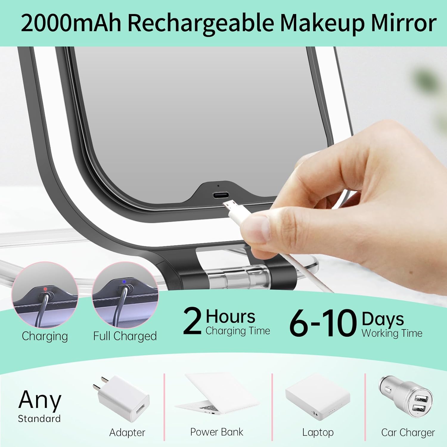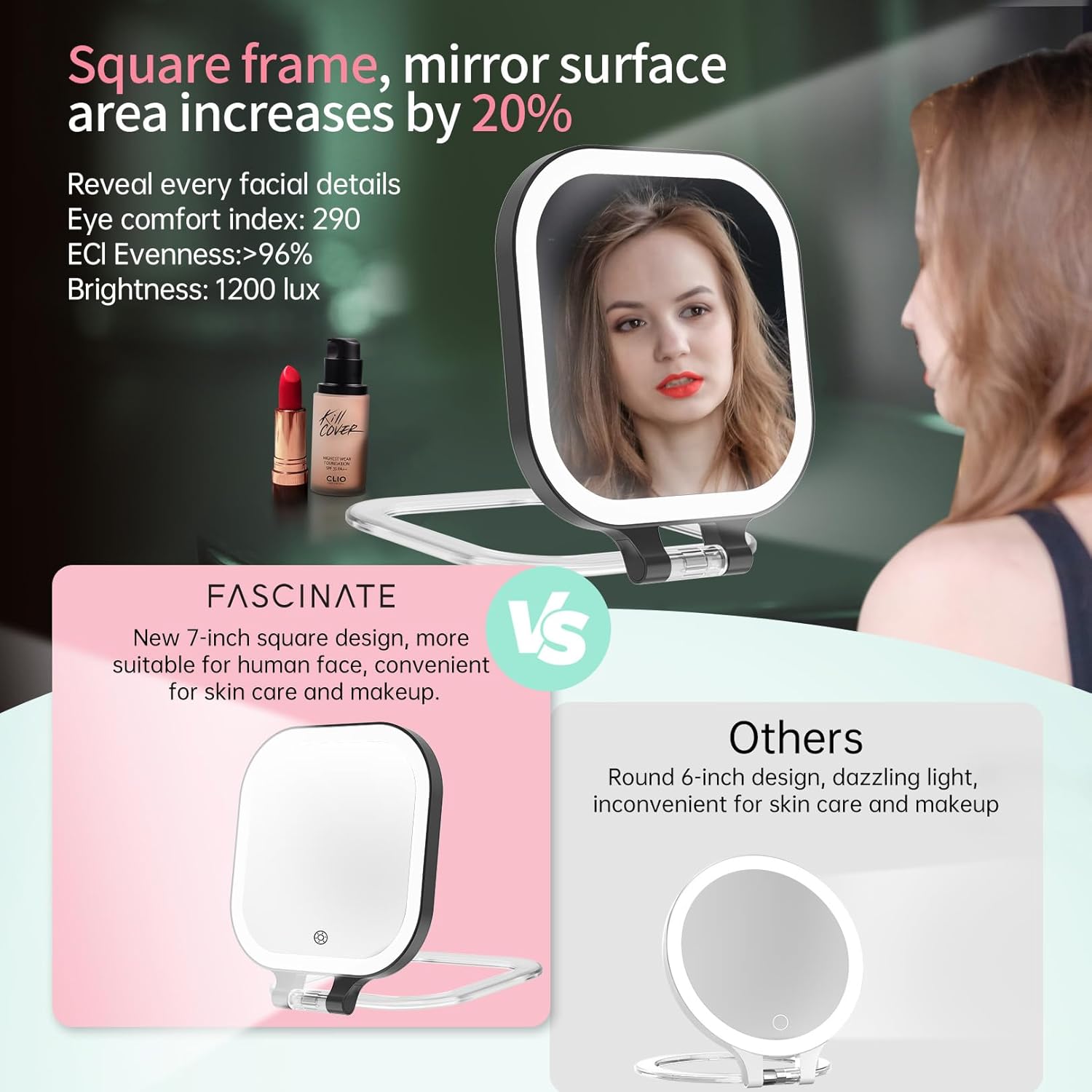 - 💝【FASCINATE 2025 Upgraded Travel Makeup Mirror】 In response to customer requests for a more travel-friendly magnifying makeup mirror, we have upgraded the 2000mAh rechargeable lithium battery. The travel mirror with light can be used for 6-10 days when fully charged. The travel mirror size is: 8.1 * 7.1 * 0.98 inch, weights only 0.9 lb, which is enough to meet your makeup and touch-up needs for daily commuting and 2-3 days of business or travel.
