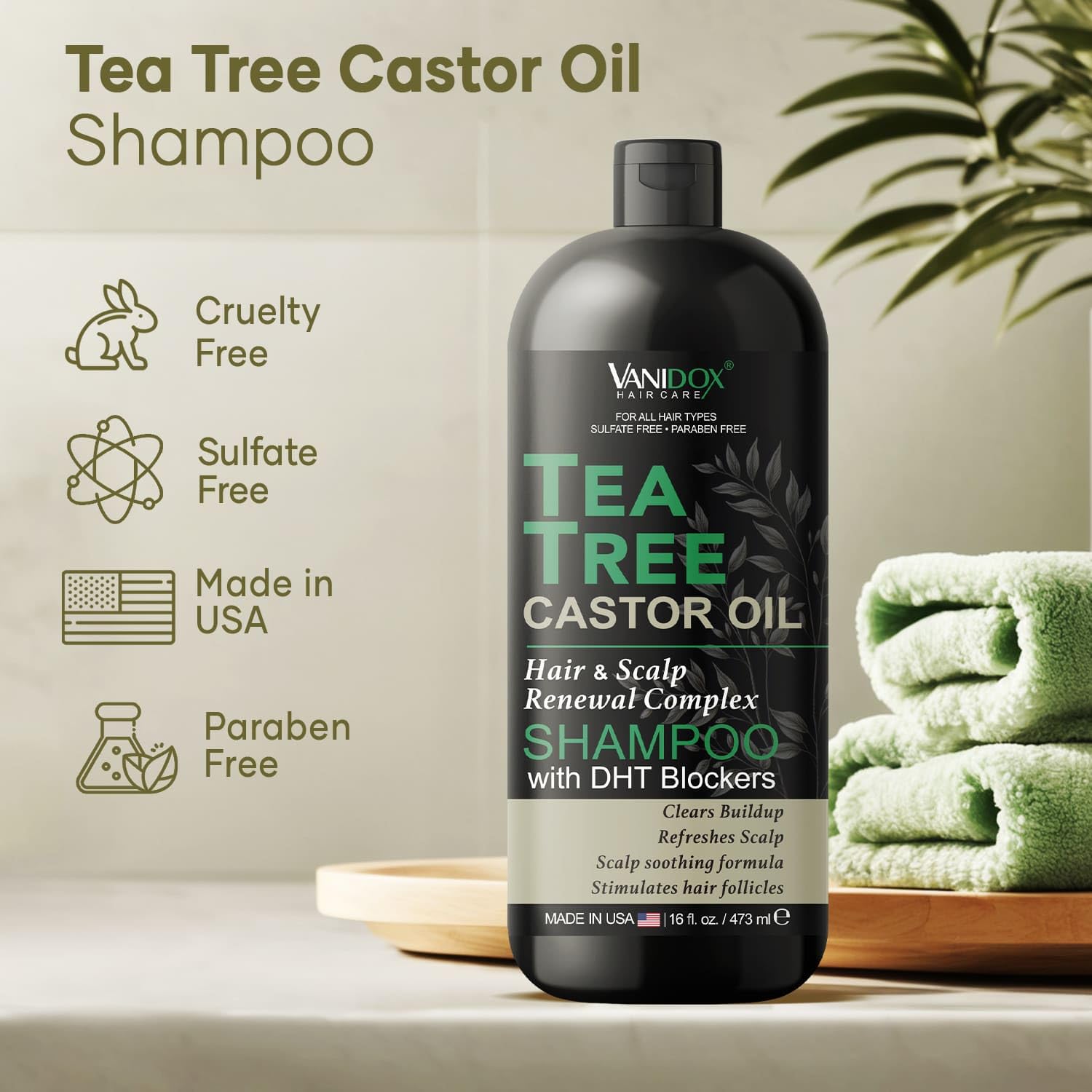 Tea Tree Oil Shampoo with Castor Oil, DHT Blockers, Itchy Scalp Relief, Supports Fuller Hair, Cleanses Dandruff & Buildup, For Men & Women, Made in USA, 16 fl oz