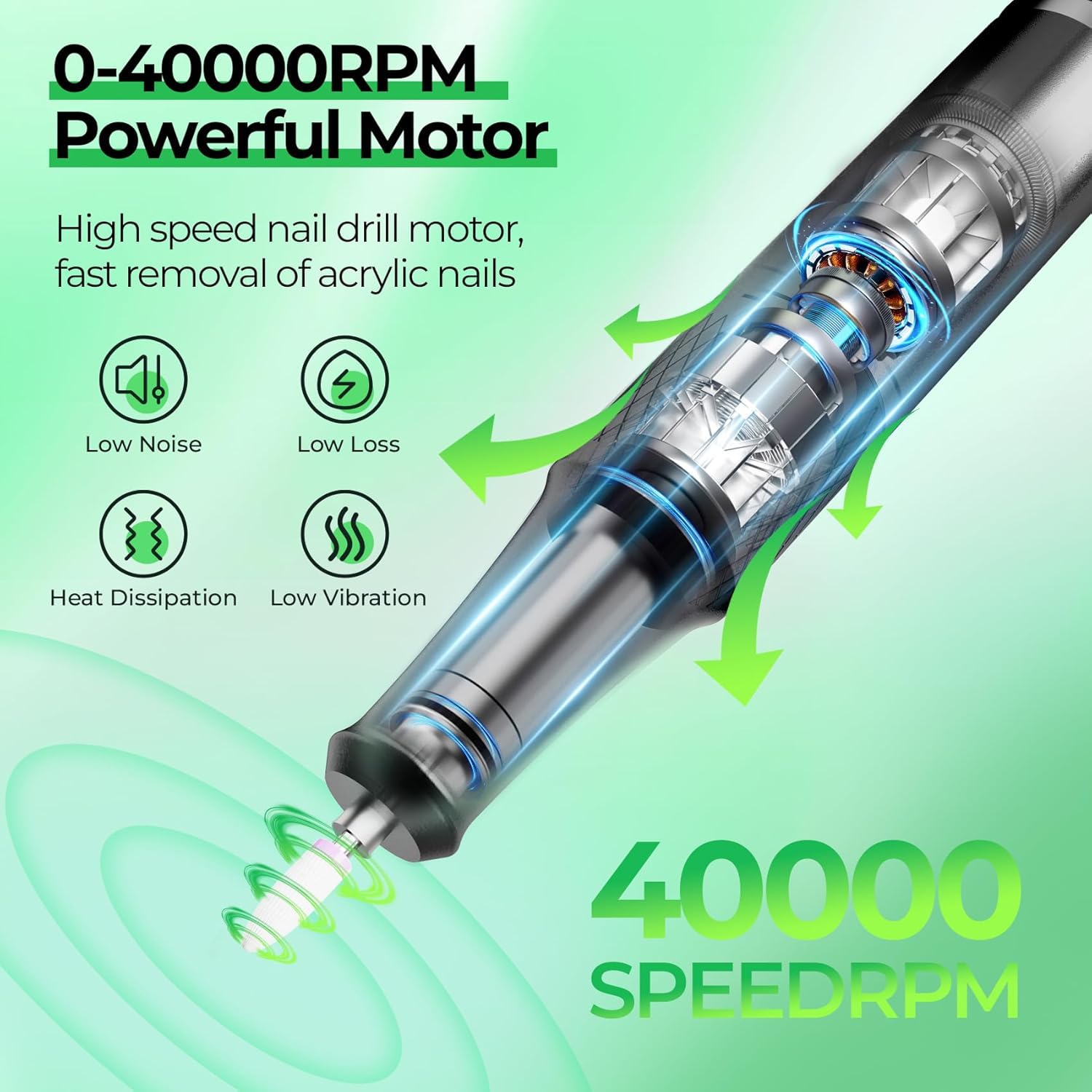 • 40000RPM Powerful Nail Drill Machine: JOSGLOI professional nail drill has a high-torque motor that delivers stable current power and speed, ensuring smooth operation even at high speeds (up to 40,000 RPM). Stable current and movement is a prerequisite for high speed, even the hardest nails can be easily handled. (Note: The JOSGLOI electric nail files are not rechargeable model)