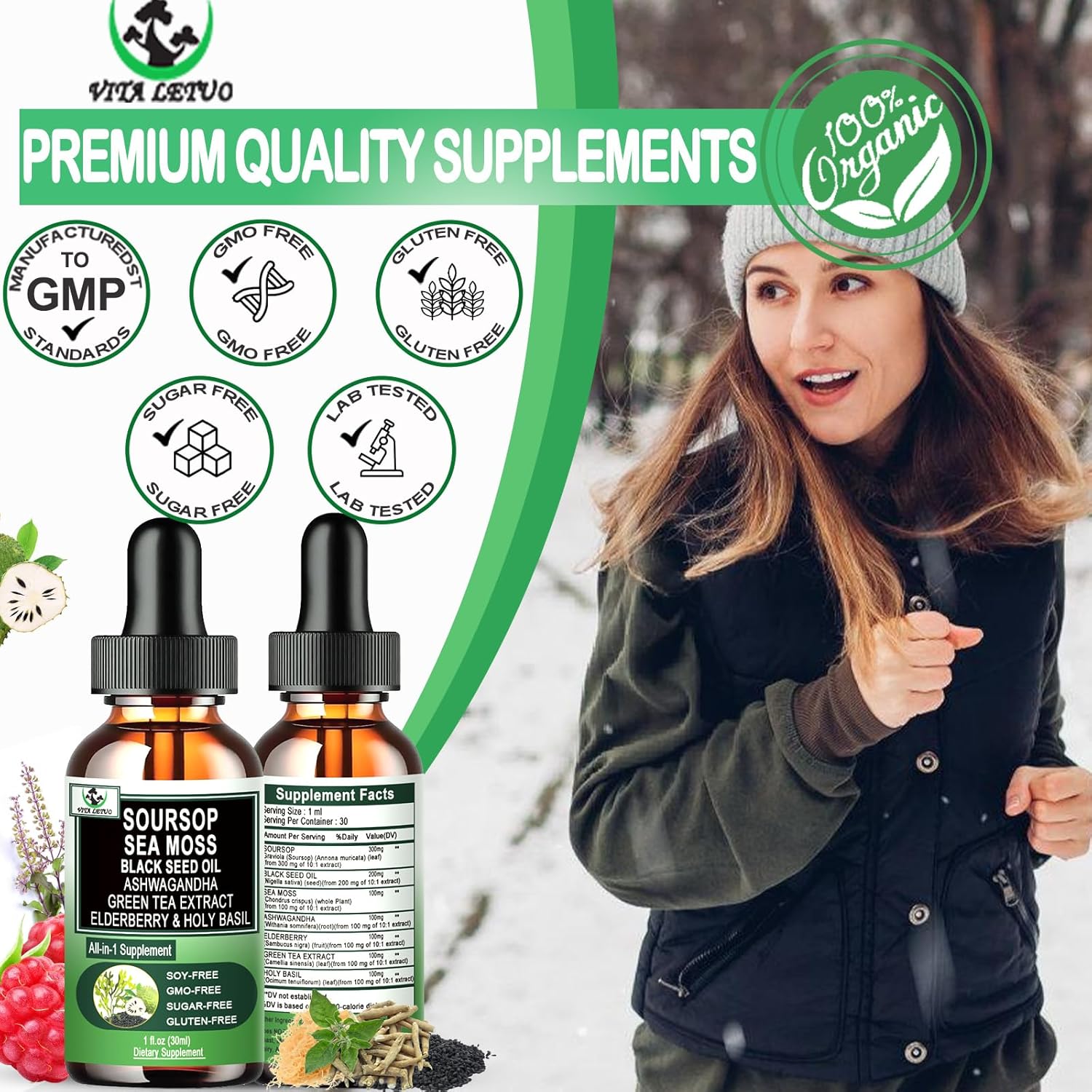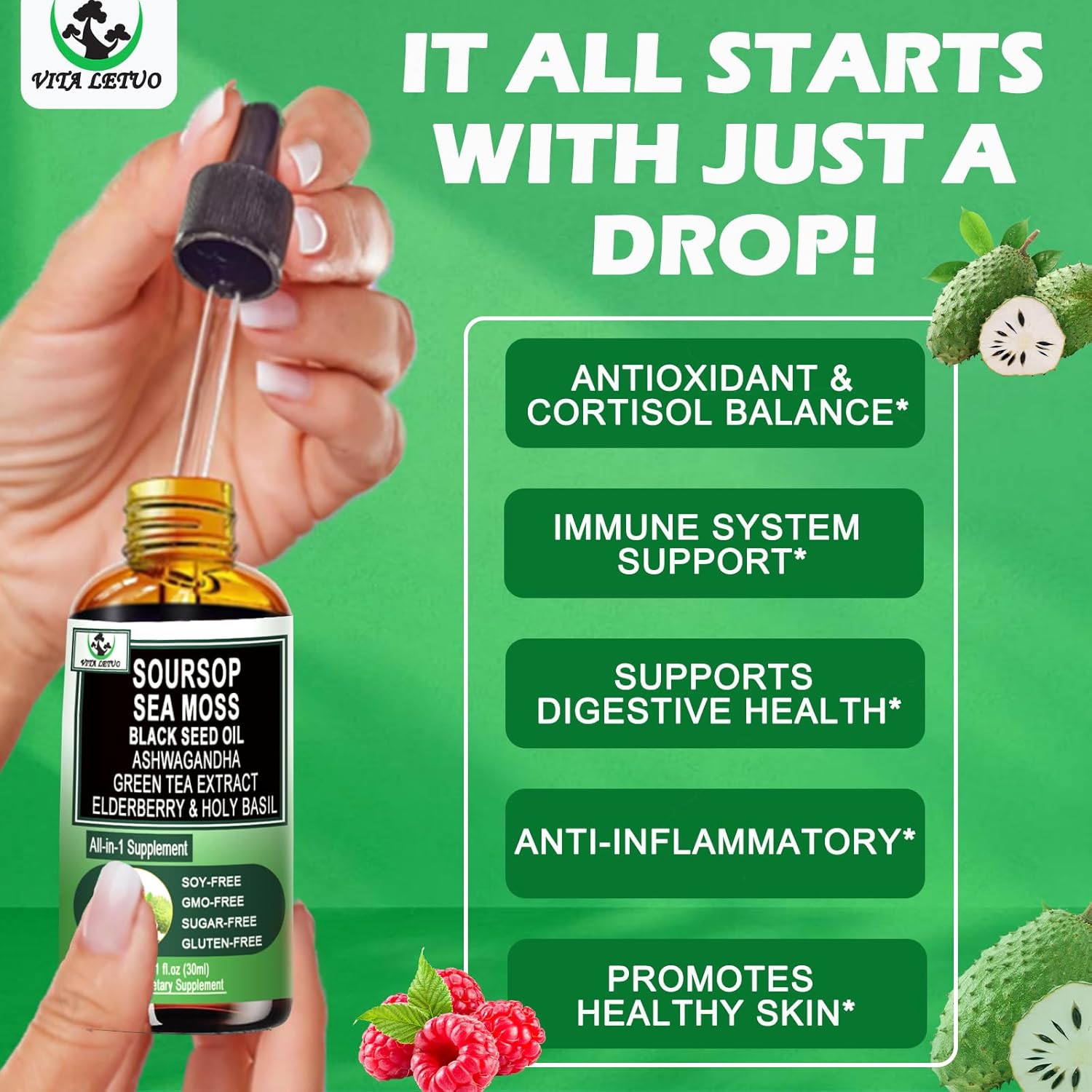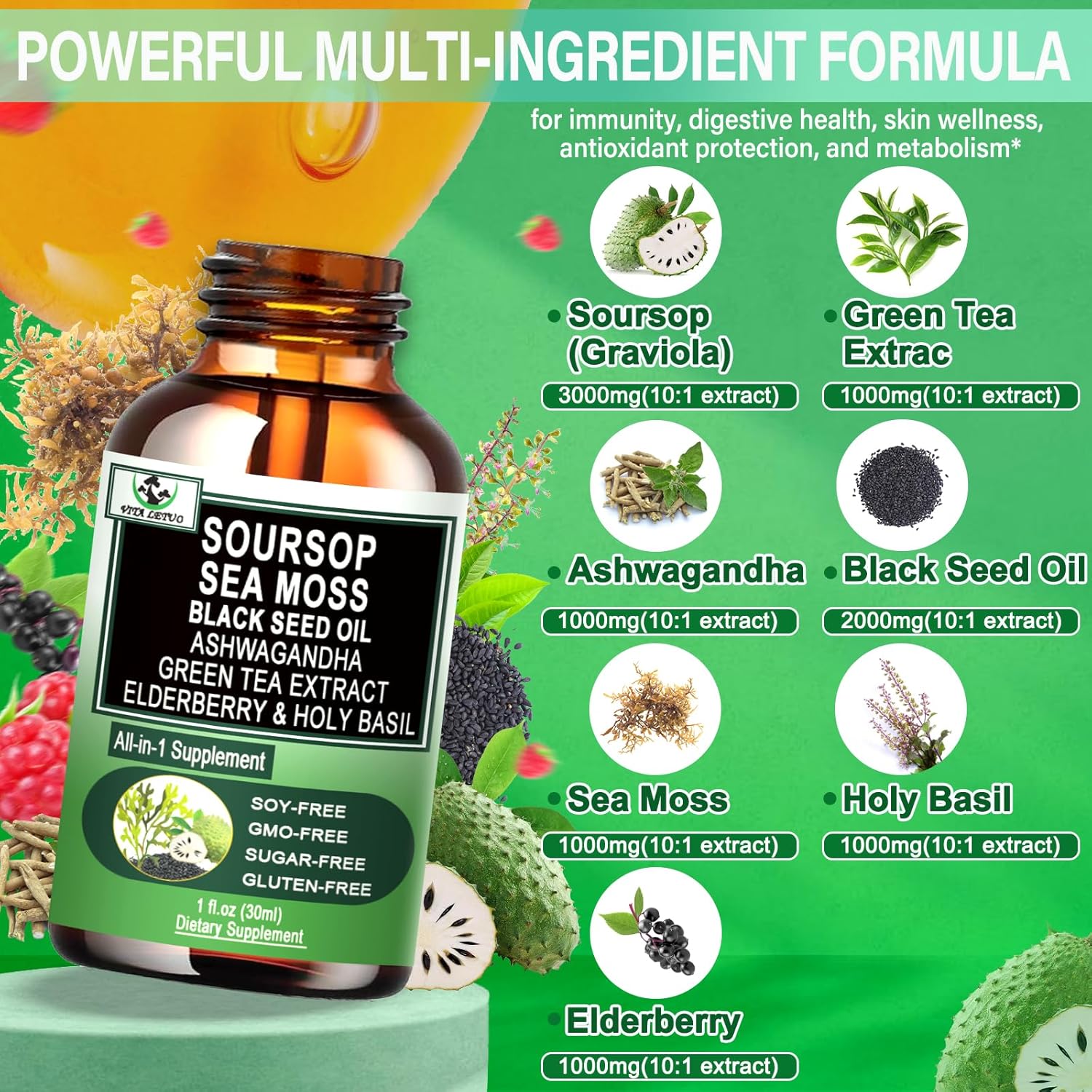 - WHY OUR SOURSOP? Our premium Soursop Liquid Drops combines the potent benefits of Seamoss, Black Seed Oil, Elderberry, Holy Basil, Green Tea Extract, and Ashwagandha for a comprehensive immune boost and optimal wellness. Unlike traditional Soursop Bitters supplements, our formula works synergistically to enhance antioxidant protection, support digestion, detoxify the body, and improve energy levels.* Experience the full power of nature with a supplement that offers balanced, all-around health support, helping you stay vibrant, energized, and immune-strong—naturally.