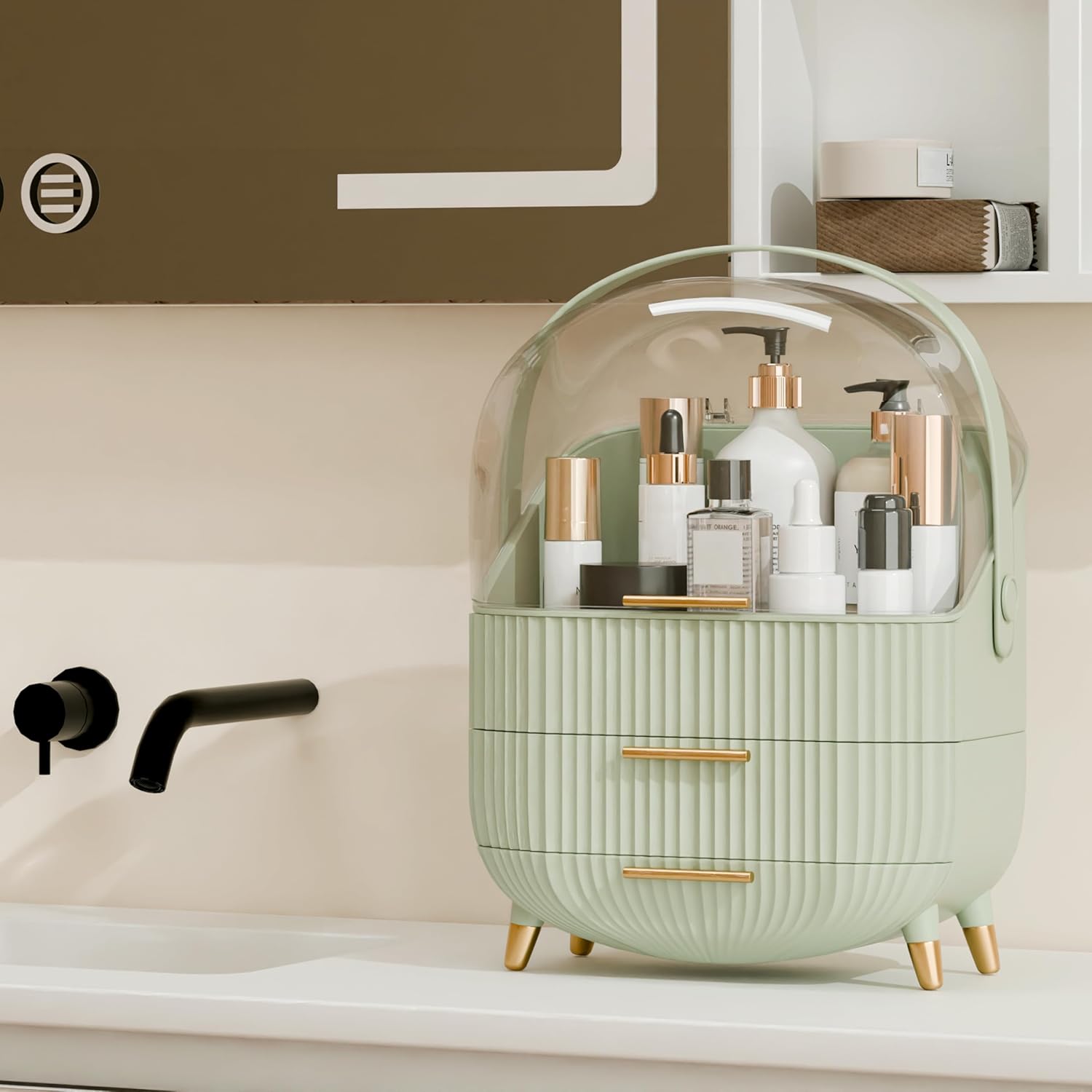 - [Chic and Contemporary Aesthetic]Enhance your living space with the sleek and modern design of this elegant makeup organizer. Adorned with a transparent acrylic protective cover and a delicate golden handle with non-slip feet, it adds a touch of sophistication to any home decor. Elevate your makeup corner with its stylish aesthetic and functional design.