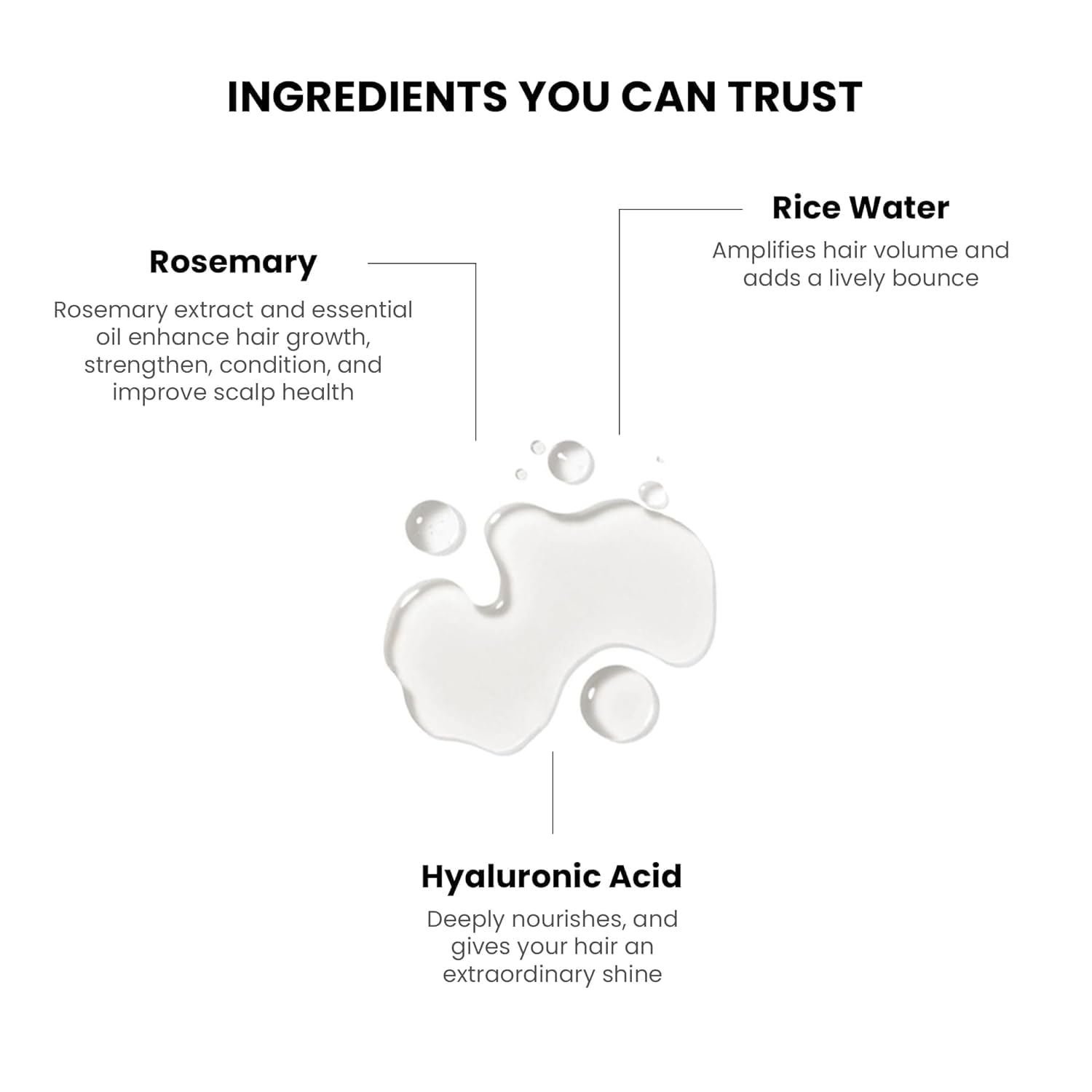 - Enriched with Rosemary & Rice Water β Infused with rosemary water, this hair care mist enhances your routine with its botanical-rich formula. The addition of rice water and hyaluronic acid helps maintain moisture balance, keeping your hair feeling fresh and healthy-looking. Use it daily for an instant hydration boost.