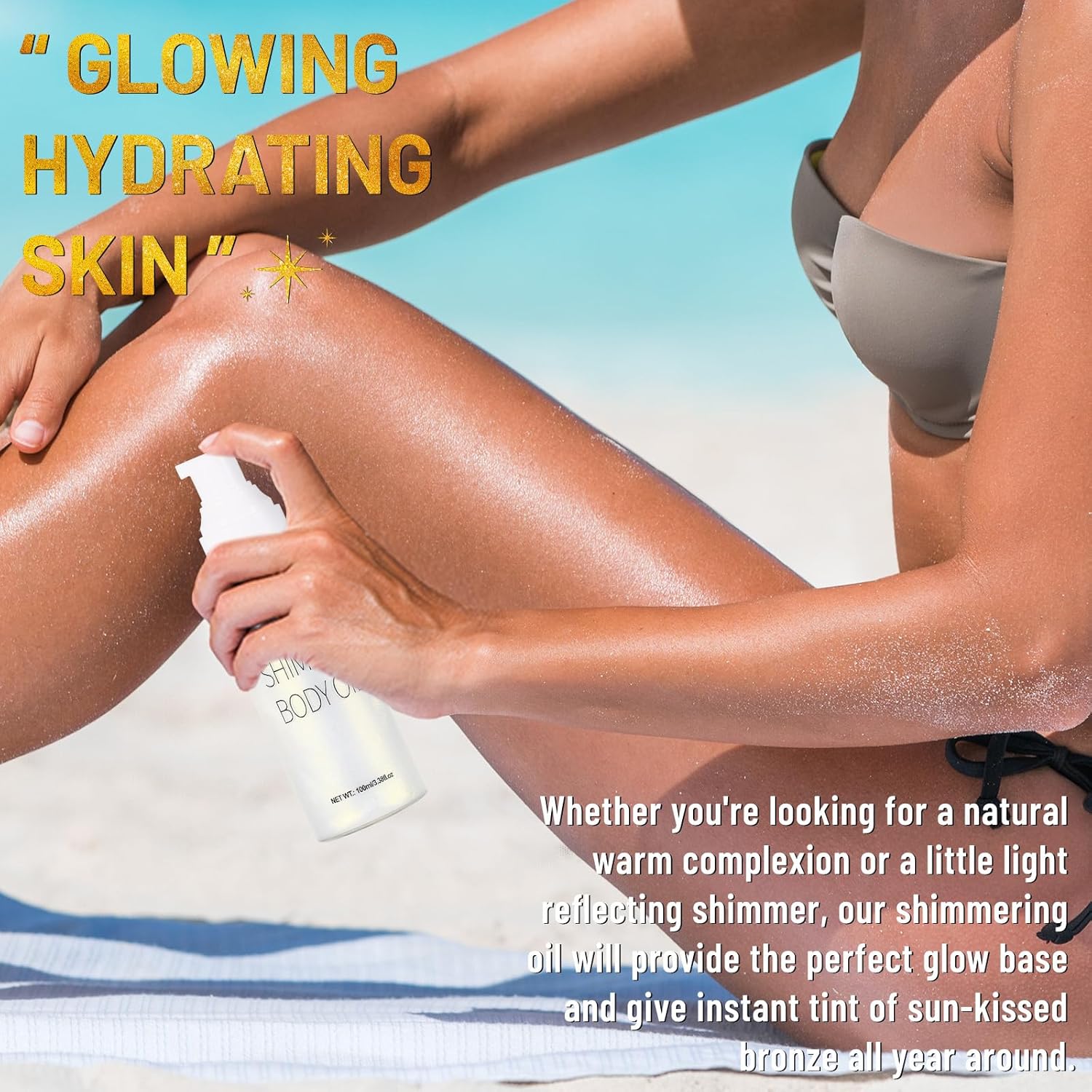 - 【UCANBE 100ml Shimmer Body Oil Glowing Luminizer】This shimmering body glow oil made to top off your natural-looking healthy glow and brightens your complexion, the flecks of shimmer catch the light and make your skin shine, get you instant bronze skin look with some glitter, giving skin an attractive shimmer in the sun. Definitely a must-have for girls and women to keep their skin hydrating and glowing all year 'round!