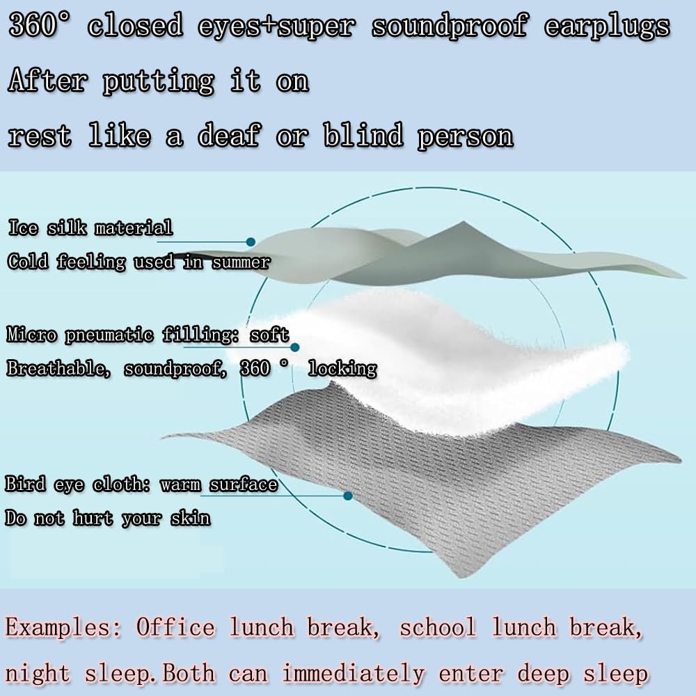 - Eye Mask+Earplugs: 360 ยฐ blackout sleep mask, filled with micro air cotton material, the mask is very gentle and covers the eyes all night long, without squeezing the nose, ears, and skin, and will not harm the skin. At the same time, wearing silicone earplugs, soft material, will not squeeze the ears, with 4 levels of sound insulation effect, will make you sleep like a deaf or blind person, quickly entering deep sleep
