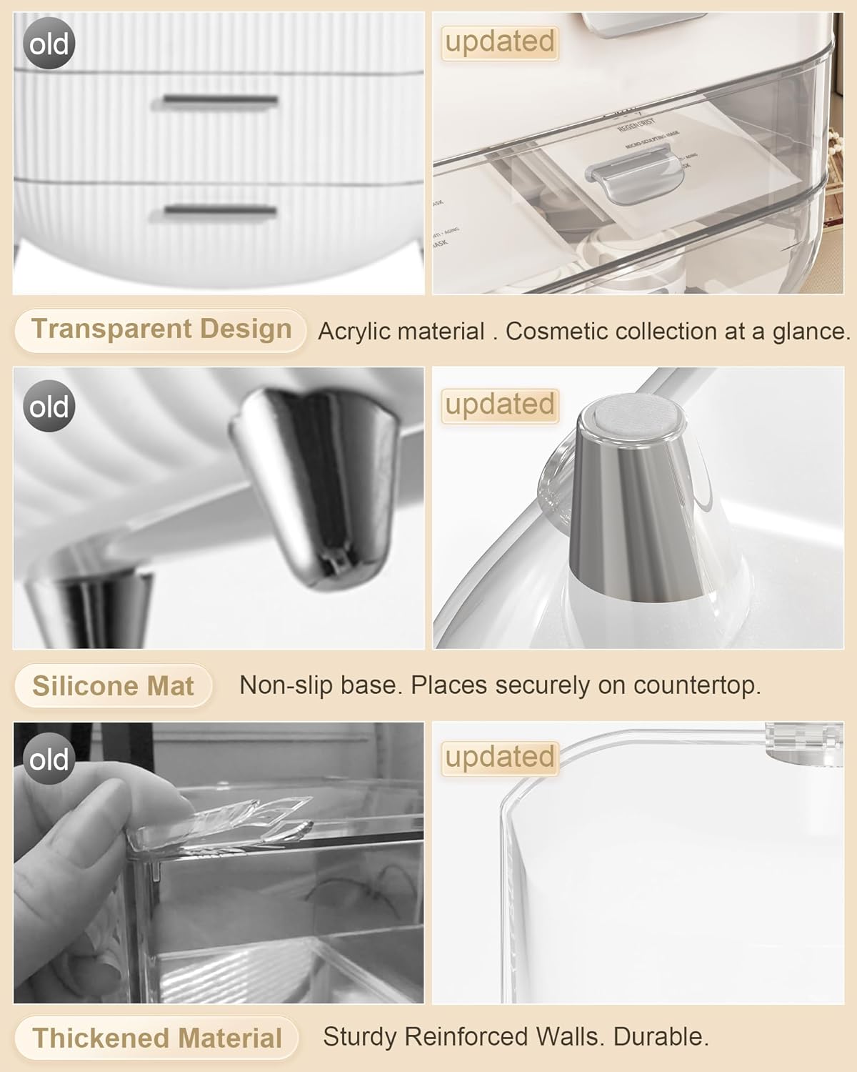 - 【Thickened Material & Non-slip】Reinforced and upgraded handle won't fall off. Easily move the skin care organizer to anywhere. The countertop organizer is made of thickened ABS material, which is stronger and more durable than normal ones. Drawer and clear top are able to open and close easily. Rubberized bottom, non-slip and won't scratch desktop.