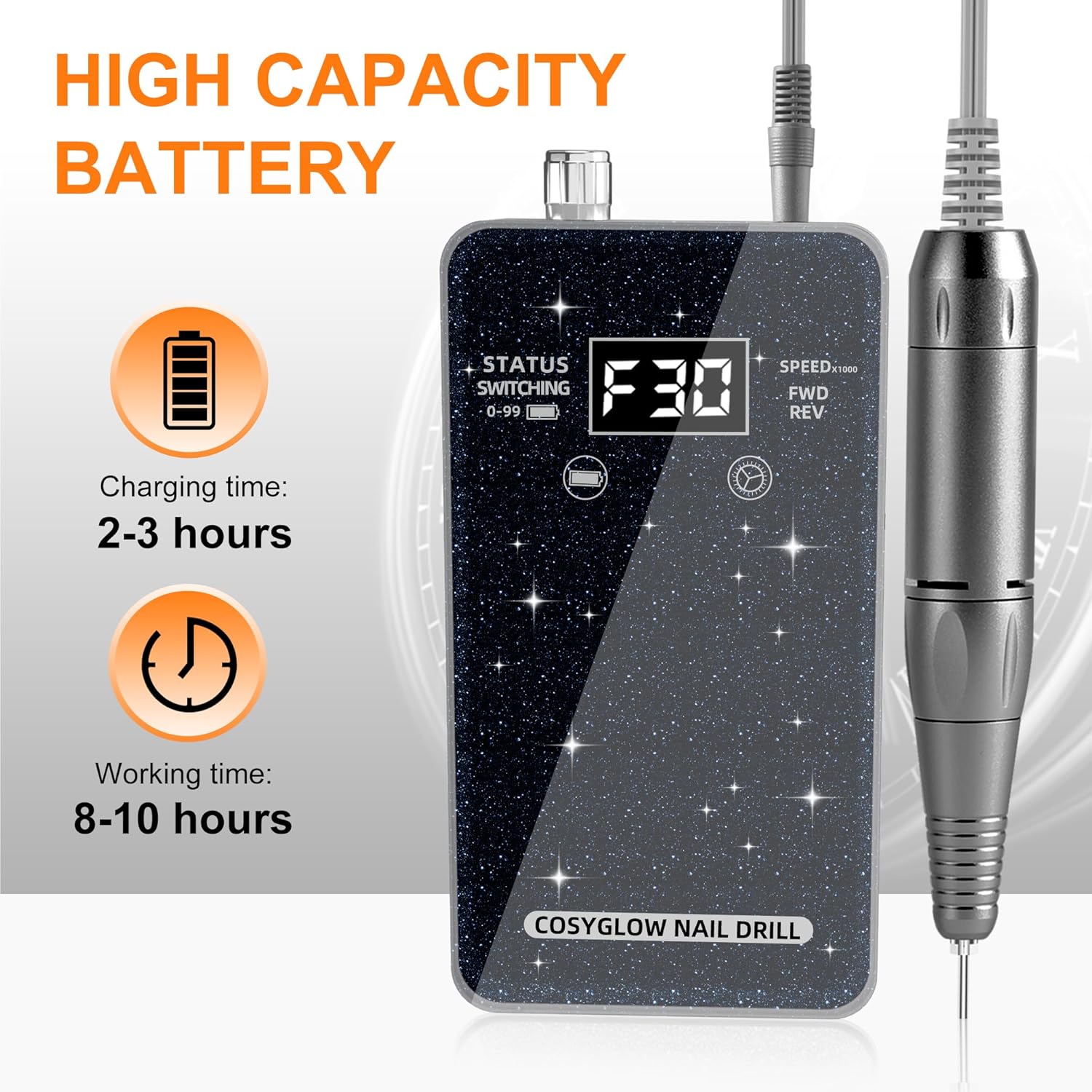 Professional Electric Nail Drill File:COSYGLOW Glitter Portable Cordless E-File Nail Drill Kit with 11 Drill Bits,30000 RPM Rechargeable Nail Drills Machine for Acrylic Nails Gel Polishing(Black)