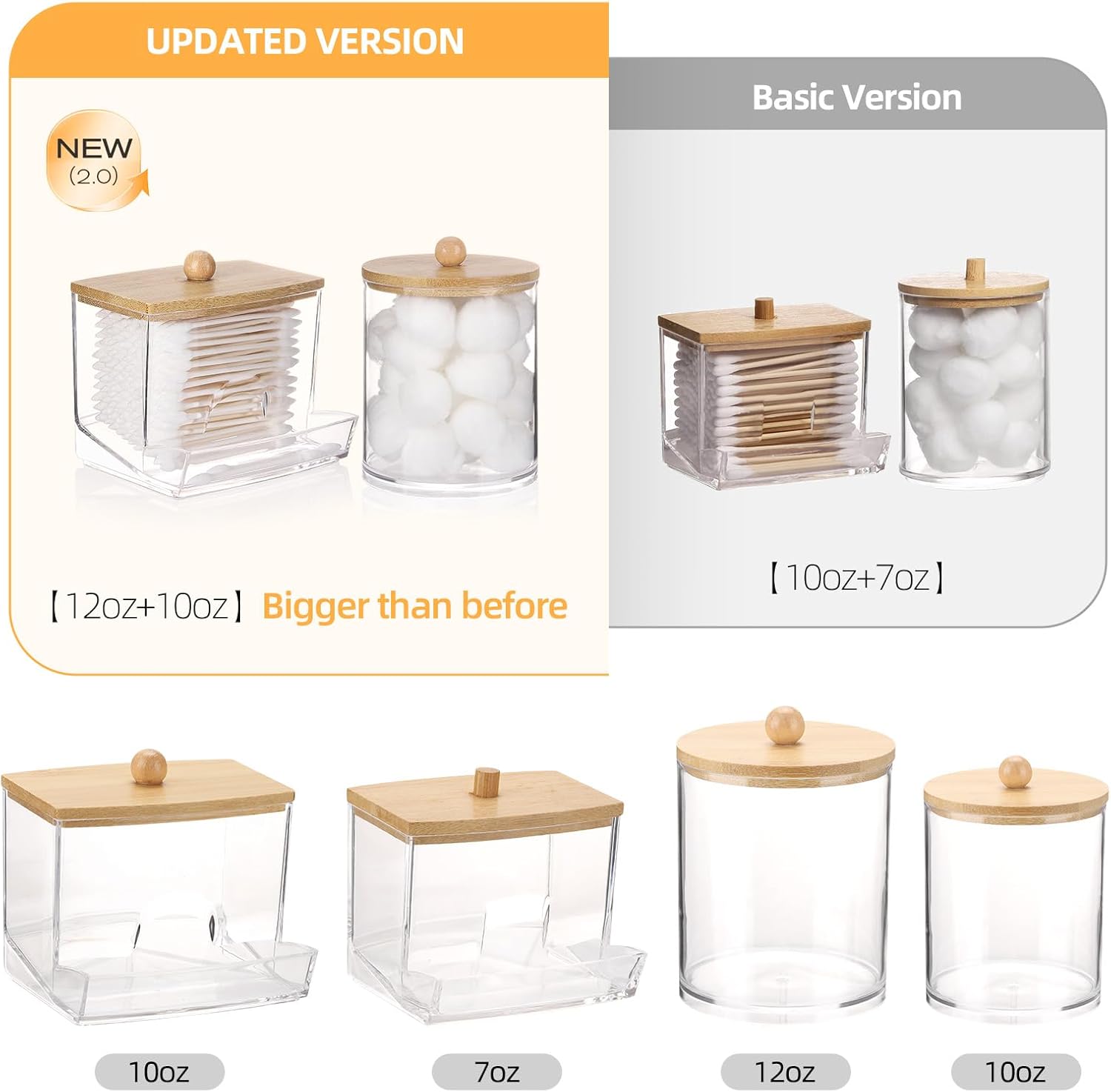 Tbestmax Qtips Dispenser, 10/12 oz Big Cotton Ball Holder Bathroom Container - Plastic Apothecary Jar Organizer for Storage Swabs, Rounds, Floss Picks - Bamboo Lids