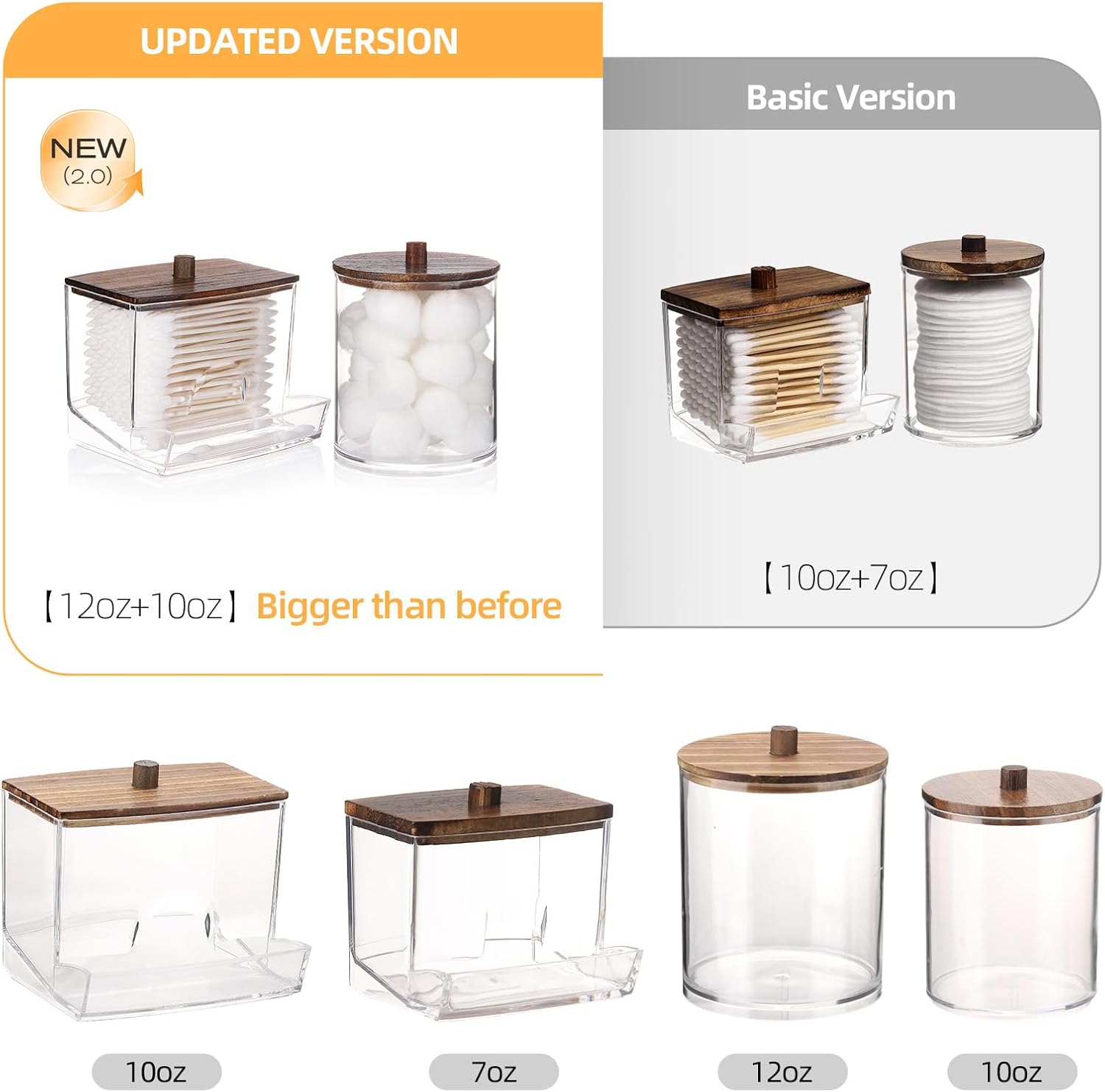 Tbestmax Qtips Dispenser, 10/12 oz Big Cotton Ball Holder Bathroom Container, Plastic Apothecary Jar Organizer for Storage Swab, Round Pads, Floss Picks - Wood Lids