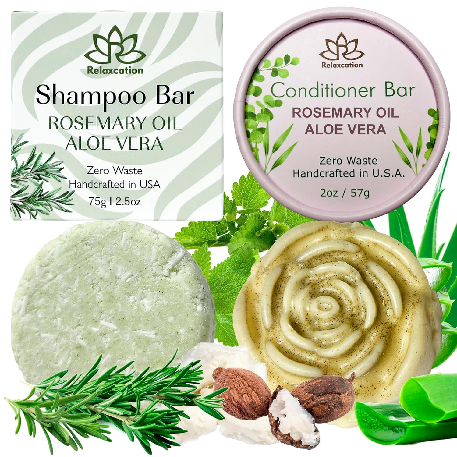 Organic Rosemary and Aloe Vera Solid SHAMPOO BAR AND CONDITIONER BAR for Hair Growth, Refreshing and Hydrating | Herbal Shampoo with Rosemary, Peppermint, Castor Oil, Argan Oil, and Betaine | USA