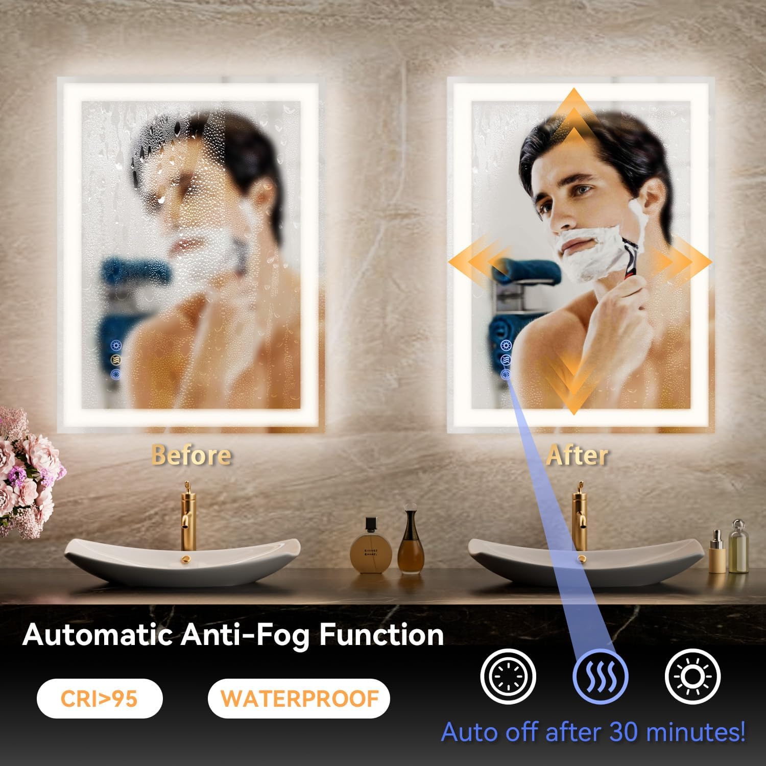 - 【Sealed Design, Waterproof & Moisture-Resistant】Fully sealed and IPX4+ rated, this mirror is specially built for humid spaces. It features certified waterproof components and grounding protection to prevent electric shock from leakage-safety you can trust. 196 LEDs/m and CRI>95 provide bright, uniform, and soft lighting without flicker or dark spots. Designed for bathroom safety but also perfect for bedroom, salon, or entryway-offering better protection and performance than standard mirrors