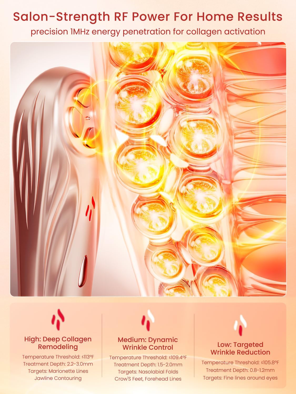 - 【Professional-Grade RF Technology】Experience salon-quality skin rejuvenation with Nulift 1MHz bipolar RF technology. Energy penetrates deep into the skin's support layer (0.8-3.0 mm) to stimulate natural collagen renewal. The gentle warming sensation indicates the RF is working beneath the surface - this is different from immediate intense surface treatments. Smart temperature control ensures safety. Perfect for nighttime self-care - while you relax, your skin continues to improve and become firmer and plumper