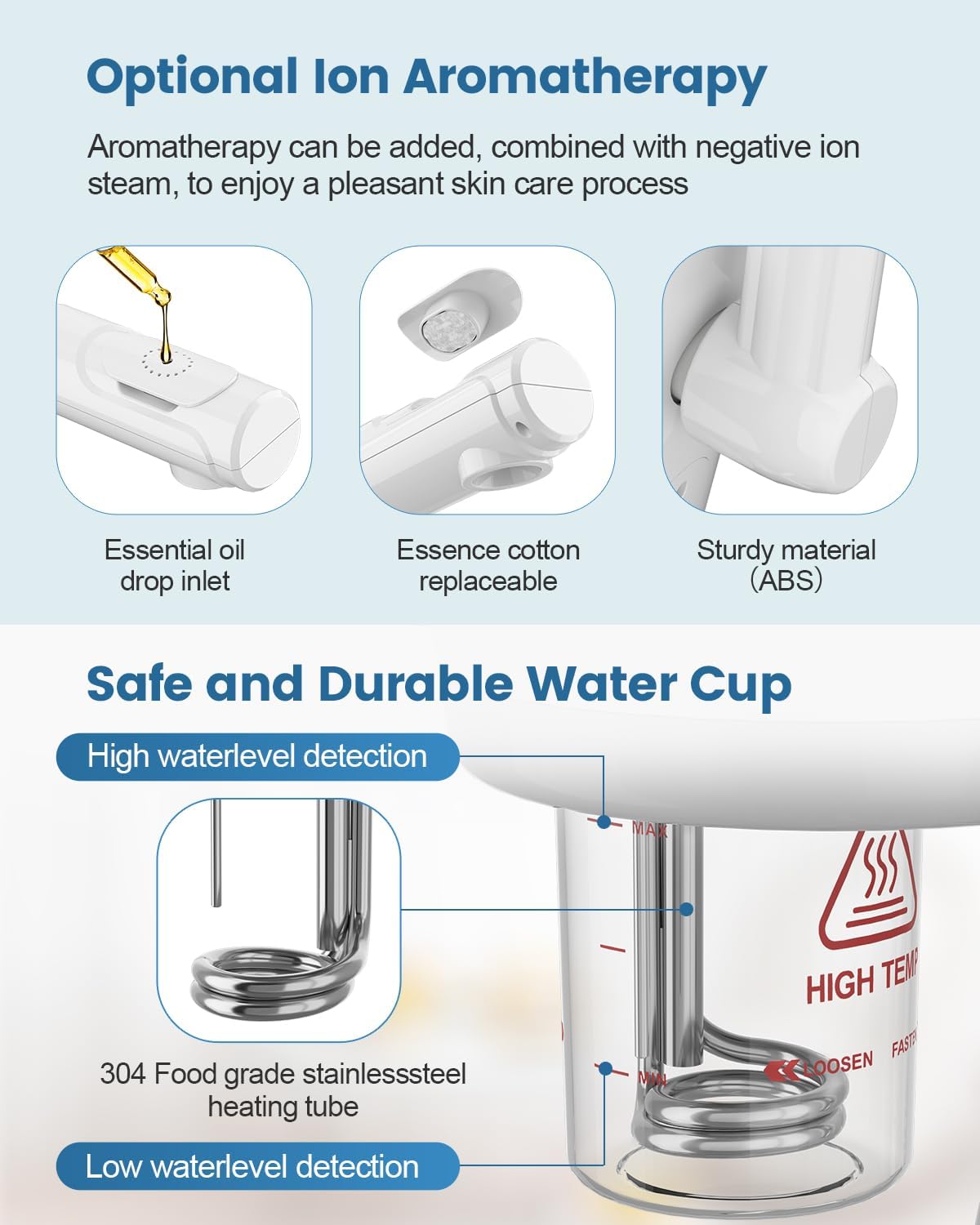 - 【Detachable, Height-Adjustable Design】With a detachable, easy-to-clean water cup and a height-adjustable stand, this steamer is built for convenience. Adjust the height and enjoy a 360° rotating nozzle, perfect for a personalized, comfortable treatment while sitting or lying down. The wheeled stand offers effortless mobility, suiting both home and salon use