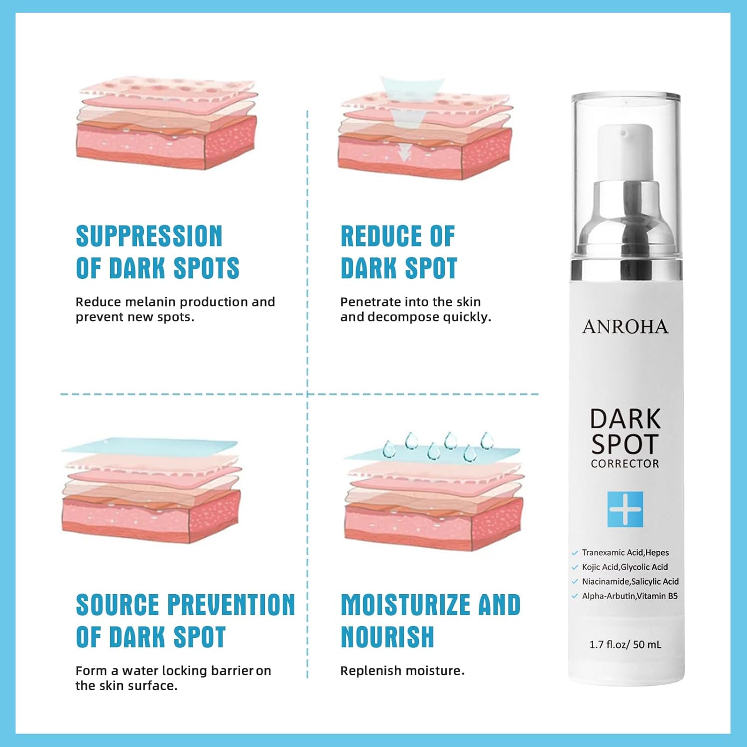 - Advanced Anti-Aging Formula: ANROHA dark spot remover cream provides powerful antioxidant protection. Its ingredients help to minimize visible signs of environmental stress with antioxidant-rich botanicals like purslane and licorice root extract.