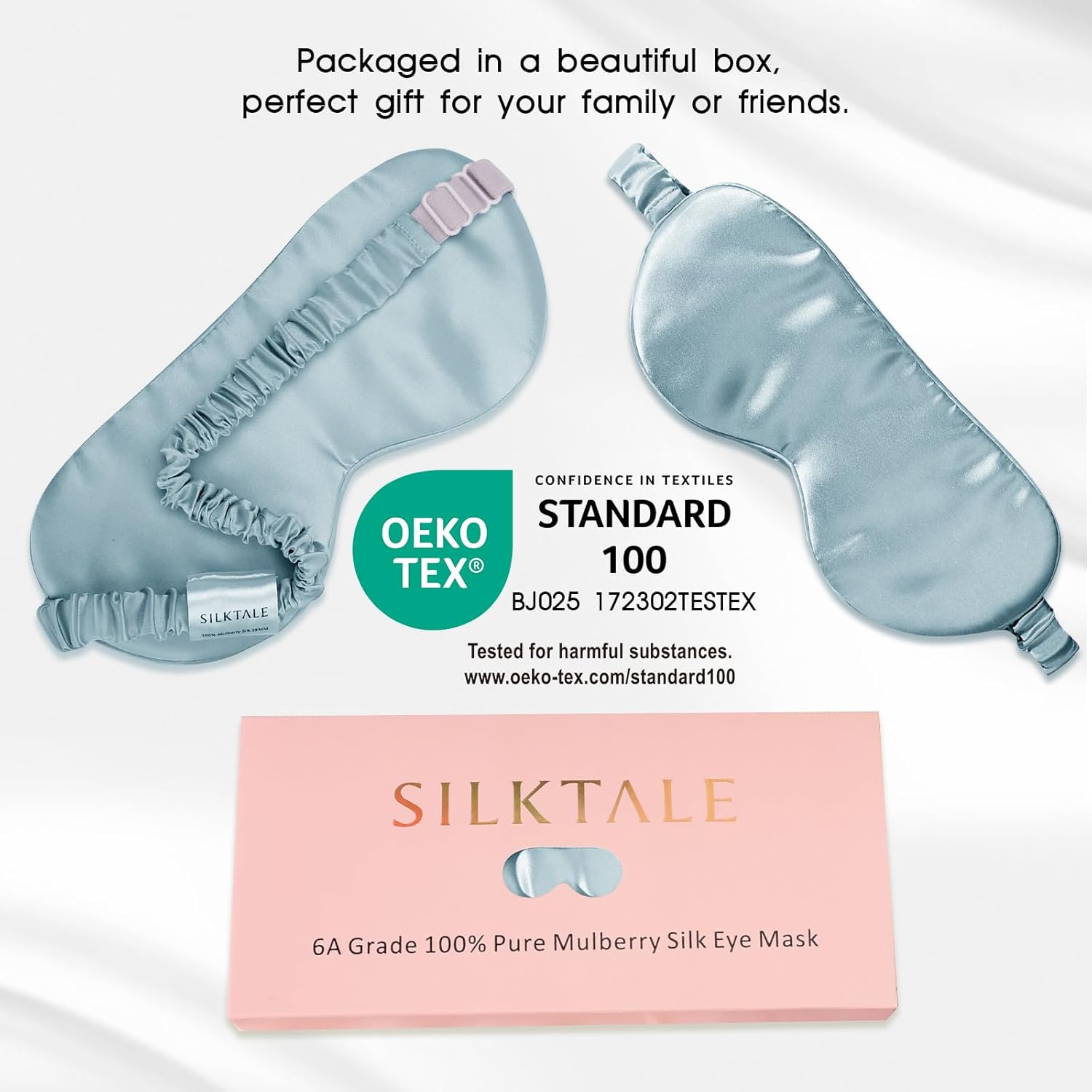 - SILKTALE sleep eye mask is made of 100% Grade 6A 19 momme Pure Mulberry Silk. Our silk is granted the OEKO-TEX STANDARD 100 certification, which is certified to be free of chemicals and colored with environmentally-safe dyes.