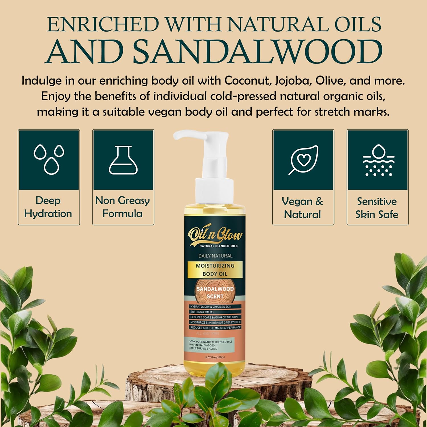 - FREE FROM HARSH CHEMICALS: Our sandalwood body oil is crafted without parabens, phthalates, artificial fragrances, or harsh chemicals, making it an ideal body oil for women and men with sensitive skin. Powered by nature, this nontoxic, non-comedogenic solution is packed with nutrient-rich oils like body coconut oil, bio oil for scars, and almond body oil. Experience pure hydration with a body oil non-greasy finish that respects your skin’s balance and leaves you feeling confident every day.