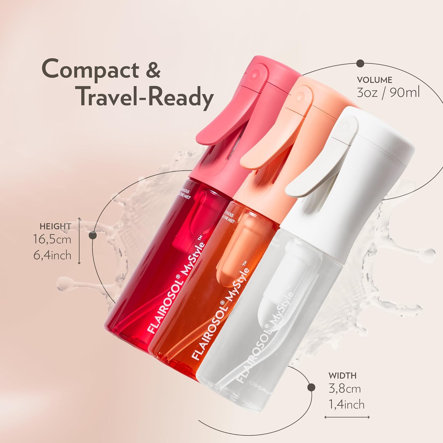 FLAIROSOL MyStyle, Spray Bottle for Hair- 3 Pack Small Travel Spray Bottle, Ultra Fine Continuous Water Mist for Face, Hairstyling, Salon, Cleaning, Beauty, Toners, Hydration & Makeup, 3.04oz / 90ml