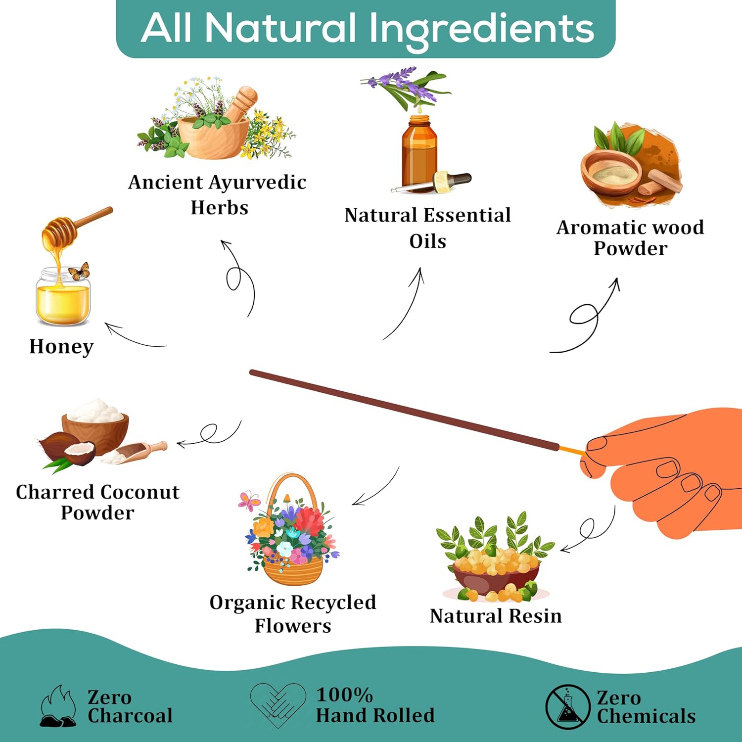 - 100% NATURAL Natural incense Sticks completely handmade MADE FROM SCRATCH by blending natural resins, Herbs, Spices with aromatic wood powders, charred coconut powder fragrant oils and honey.No Dipping in Toxic Chemicals.