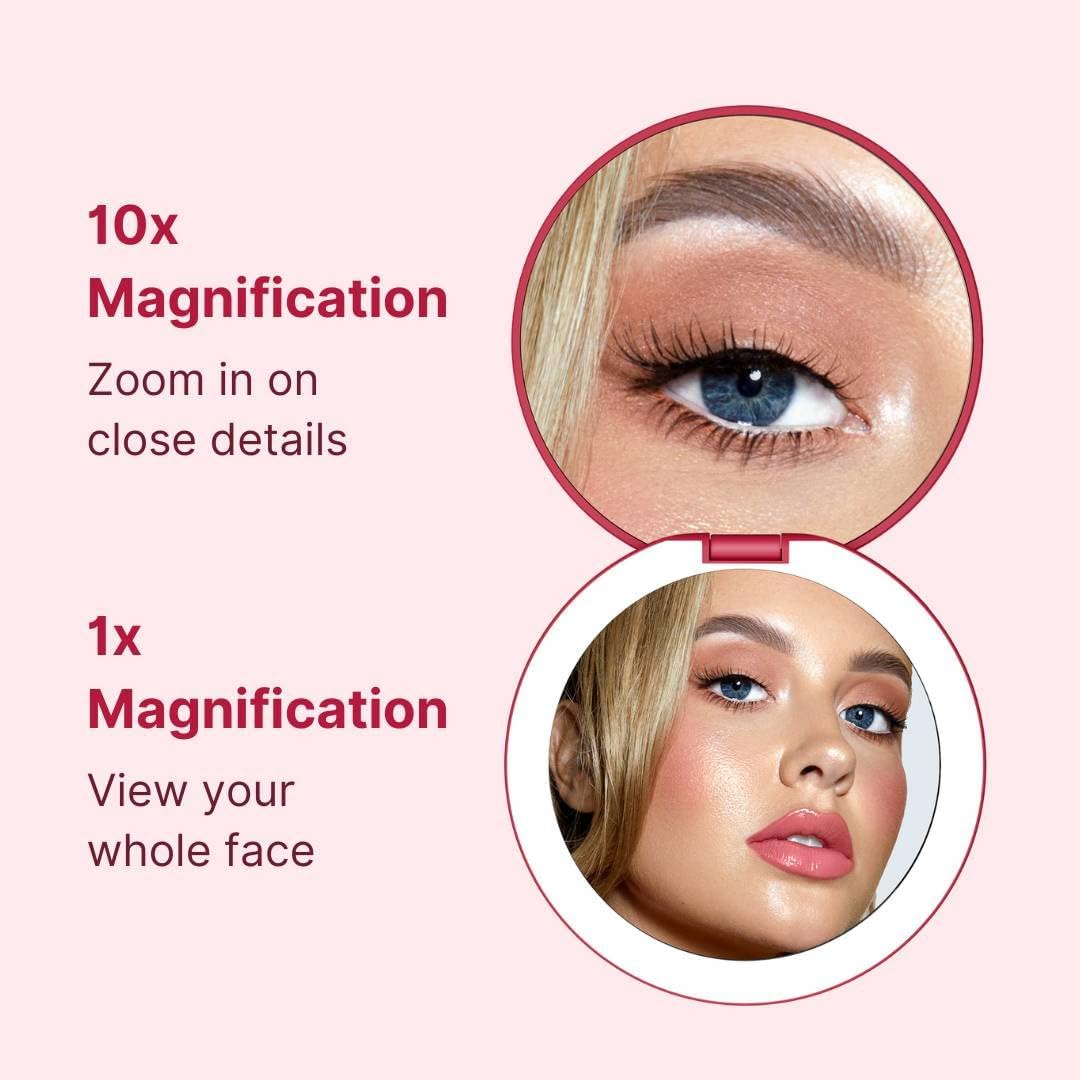 - Double-sided magnification (1x and 10x) so you can apply a full face of makeup, do a quick touch-up on the go, or focus on a detailed task like tweezing or inserting contact lenses