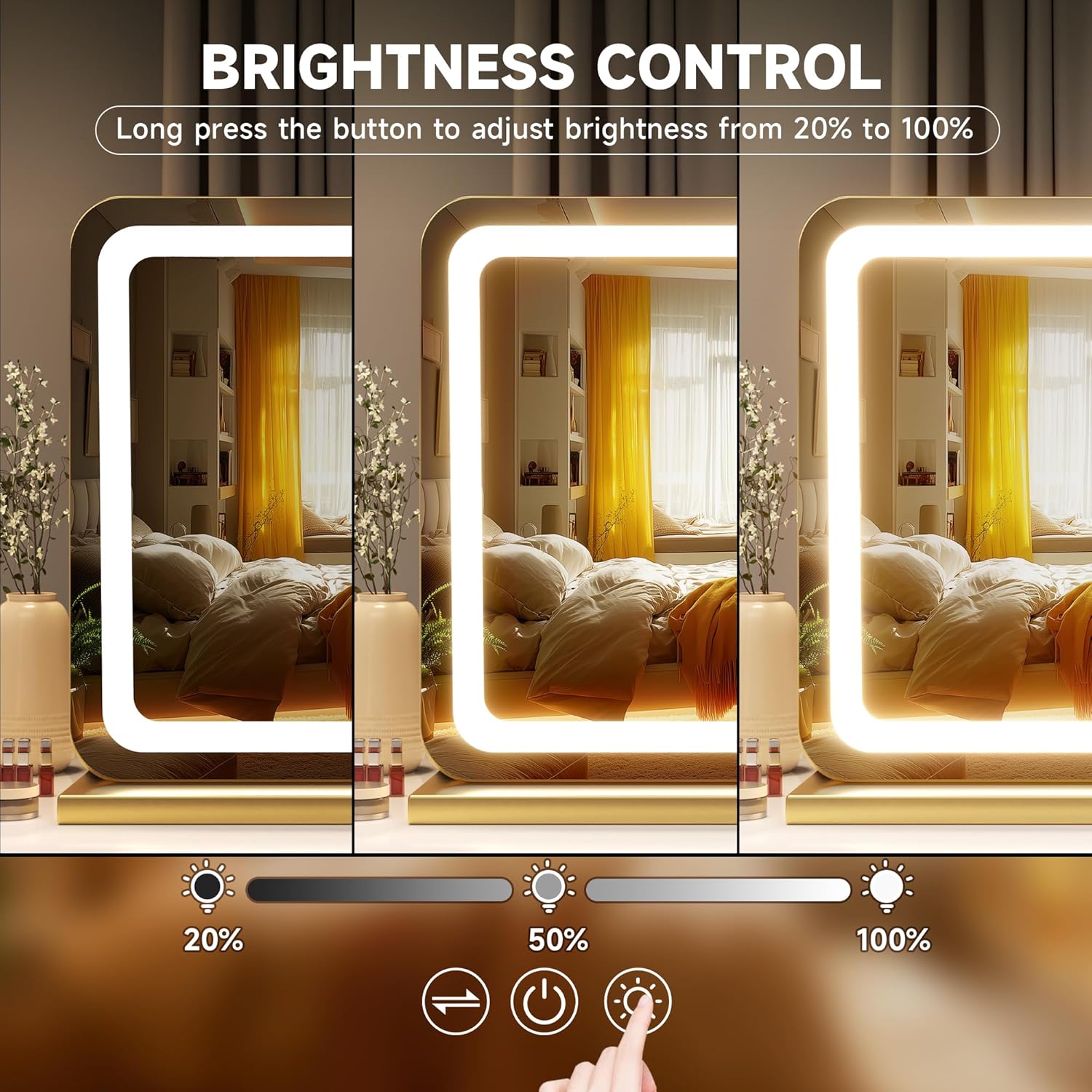 - 👍【Smart Touch Control & Memory Function】This makeup mirror with lights has 3 smart touch buttons, turn on/off the light by touching the sensor switch, Press left button to change the color modes, long press right button to adjust the led brightness. This lighted makeup mirror is specially designed memory functionfunction keep your lights setting like your last use.