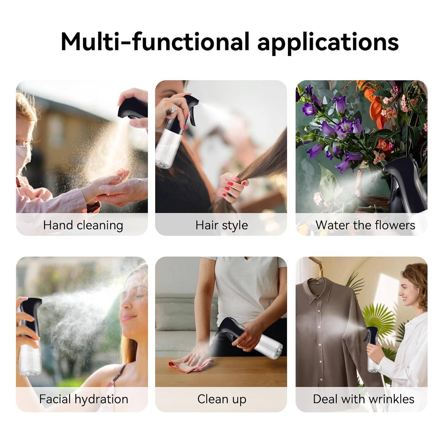 - High Quality: The continuous mist spray bottle is made of quality PET material with advanced technology, strong and not easily dented, durable and refillable. BPA-free, no smell, no leakage, and refillable. If anything goes wrong with your continuous spray bottle, please contact us directly.