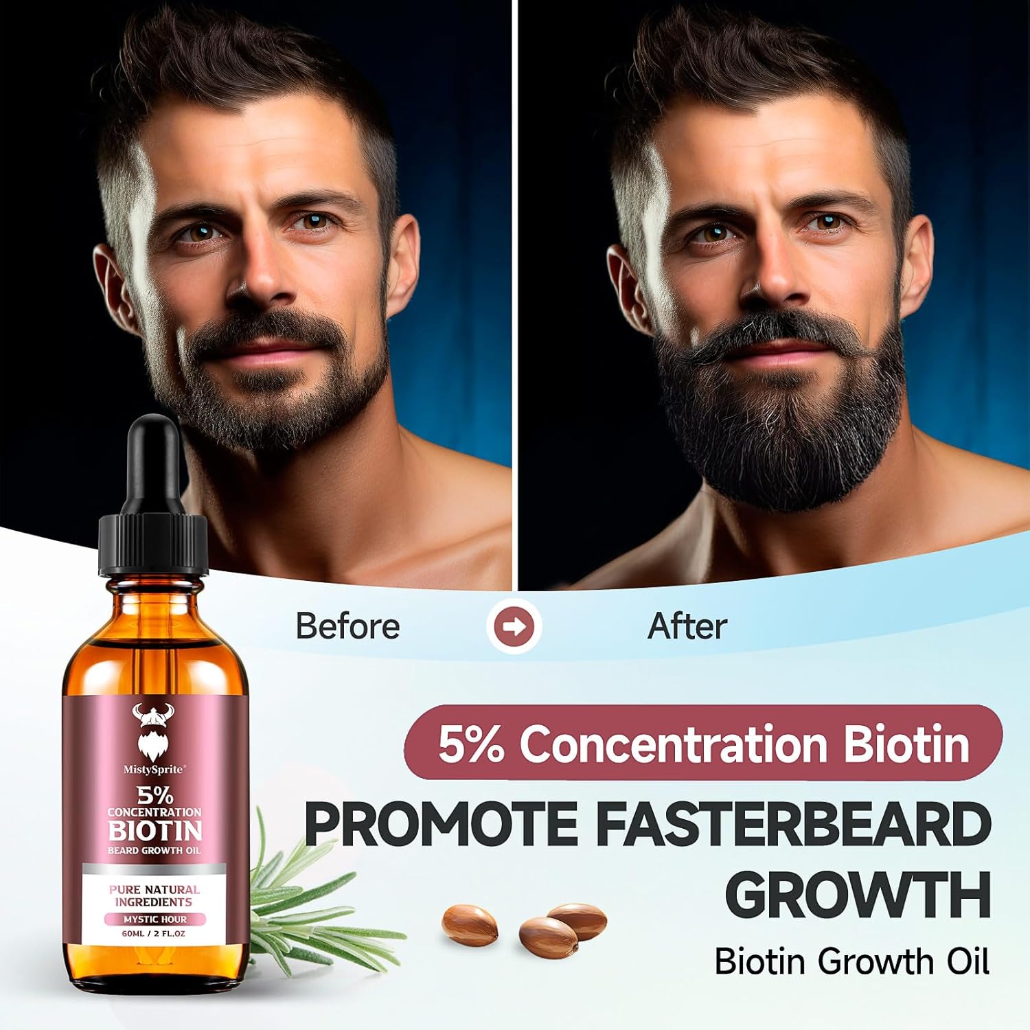 Beard Growth Oil - 5% Concentration Biotin Beard Oil for Men (2 oz) - Natural Mens Beard Oil with Argan Oil, Jojoba Oil and Vitamin, Beard Growth Softener, Moisturizer (Mystic Hour)