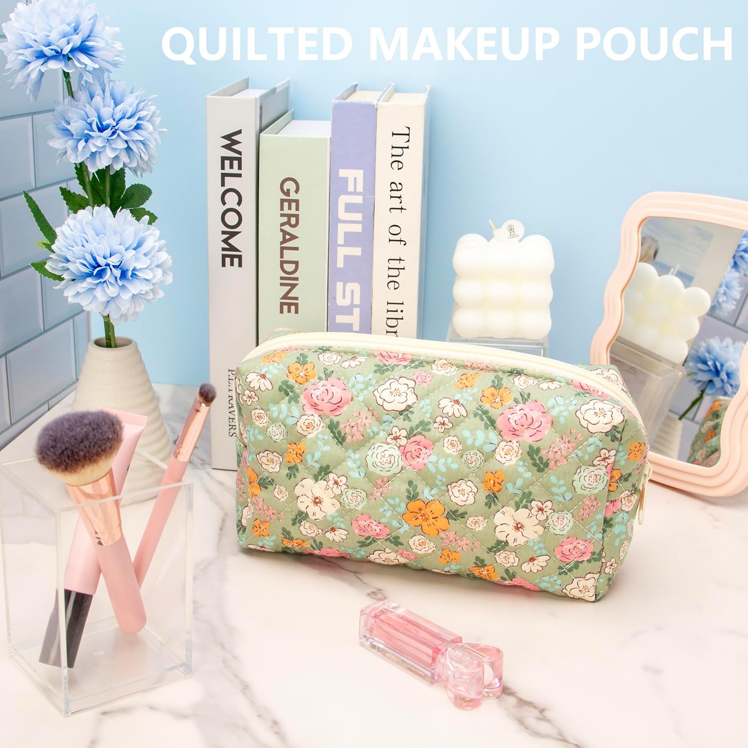 PAZIMIIK Vintage Quilted Makeup Bag Cosmetic Pouch for Brushes Pencils and Travel Make Up Accessories for Women and Girls Floral Green