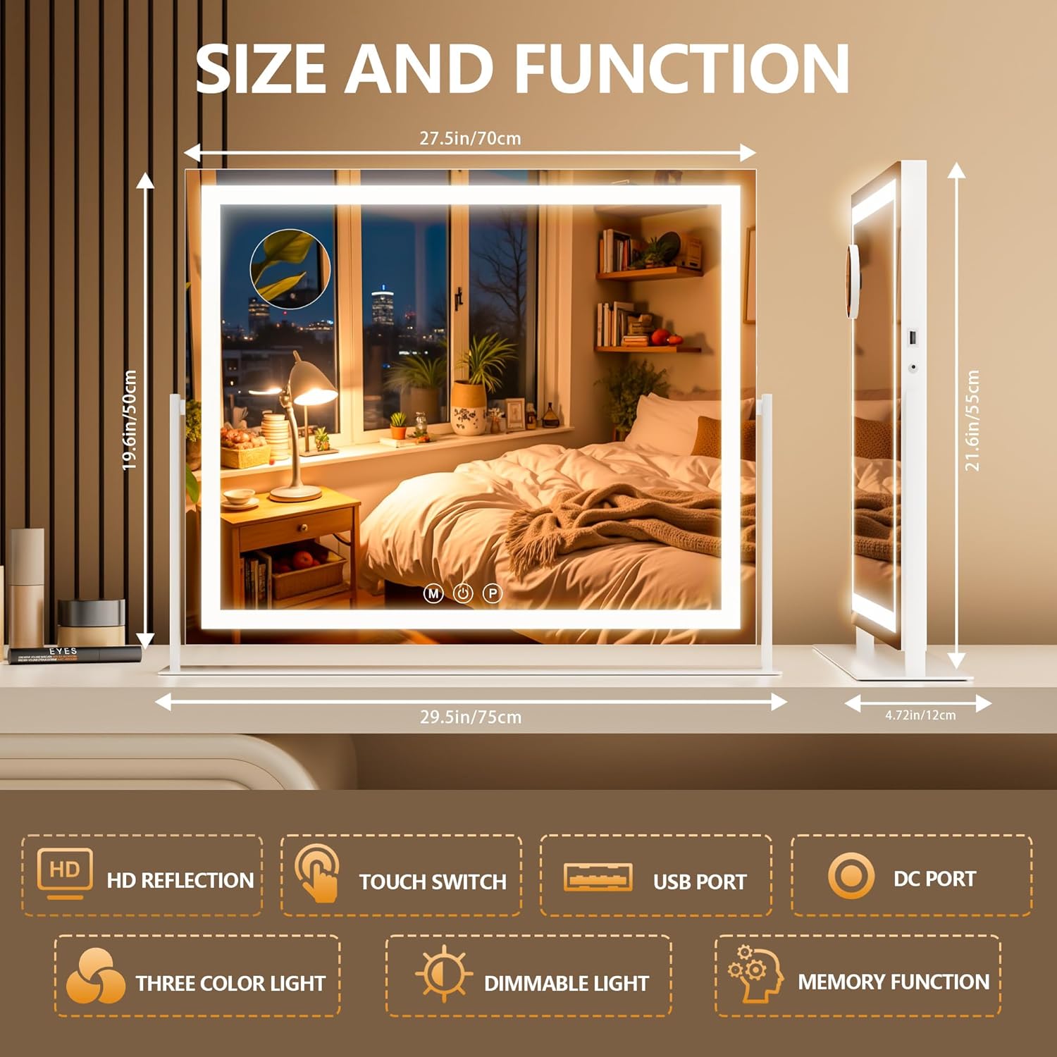 - 【Smart Touch Sensor】 Smart touch buttons for this light-up vanity mirror Simply short press power ON/OFF & change the light color, and Long press to adjust the brightness. We keep all the Functions the one touch, it can serve you great.