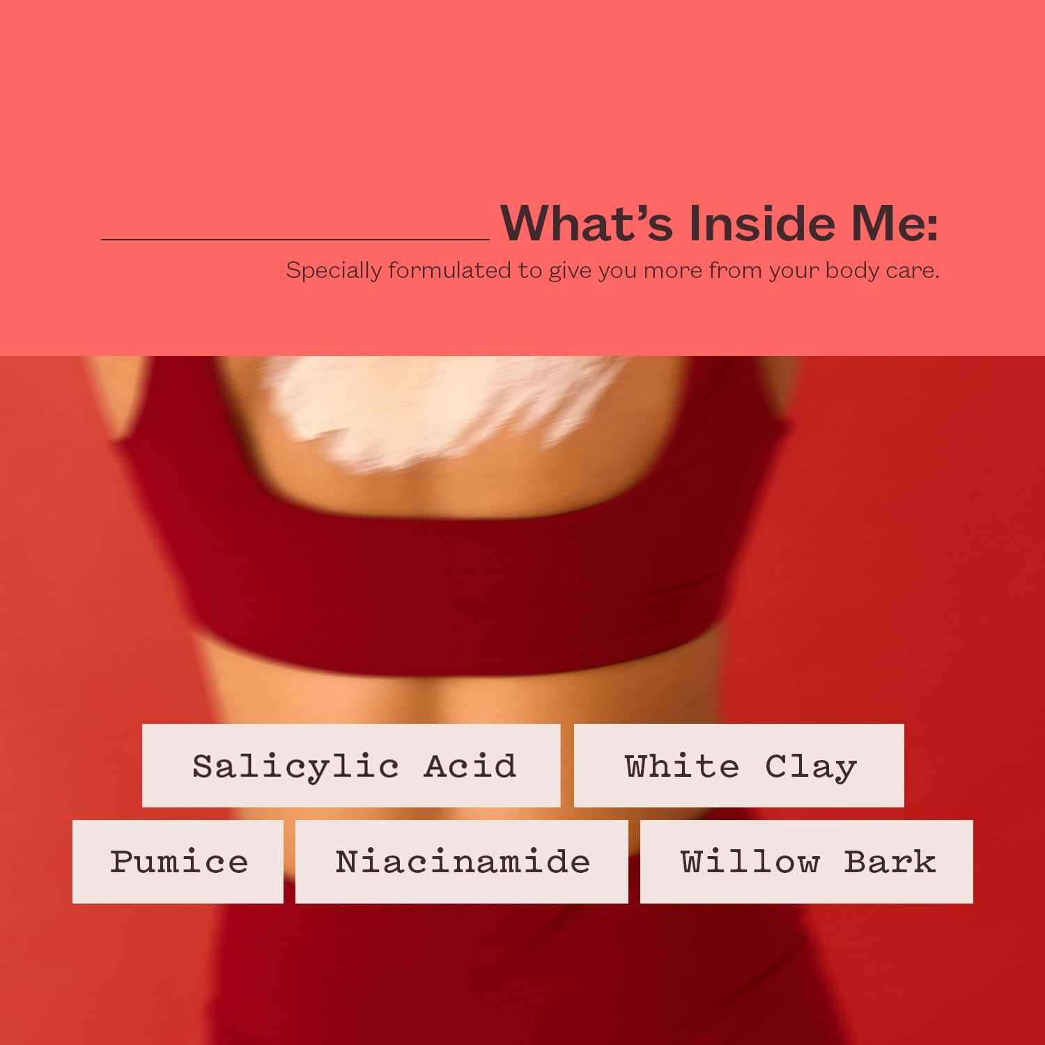 - Refining salicylic acid: Salicylic acid in the scrub works to fight body breakouts, smooth skin texture and unclog pores. It helps reduce the look of blackheads and rough patches.