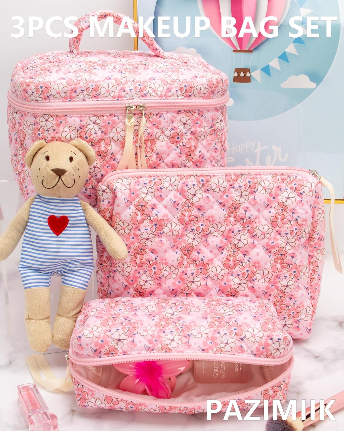 PAZIMIIK 3PCS Makeup Bag SET Large Travel Quilted Zipper Soft Cosmetic Case Pouch for Women Girls Make Up,Pink Flower