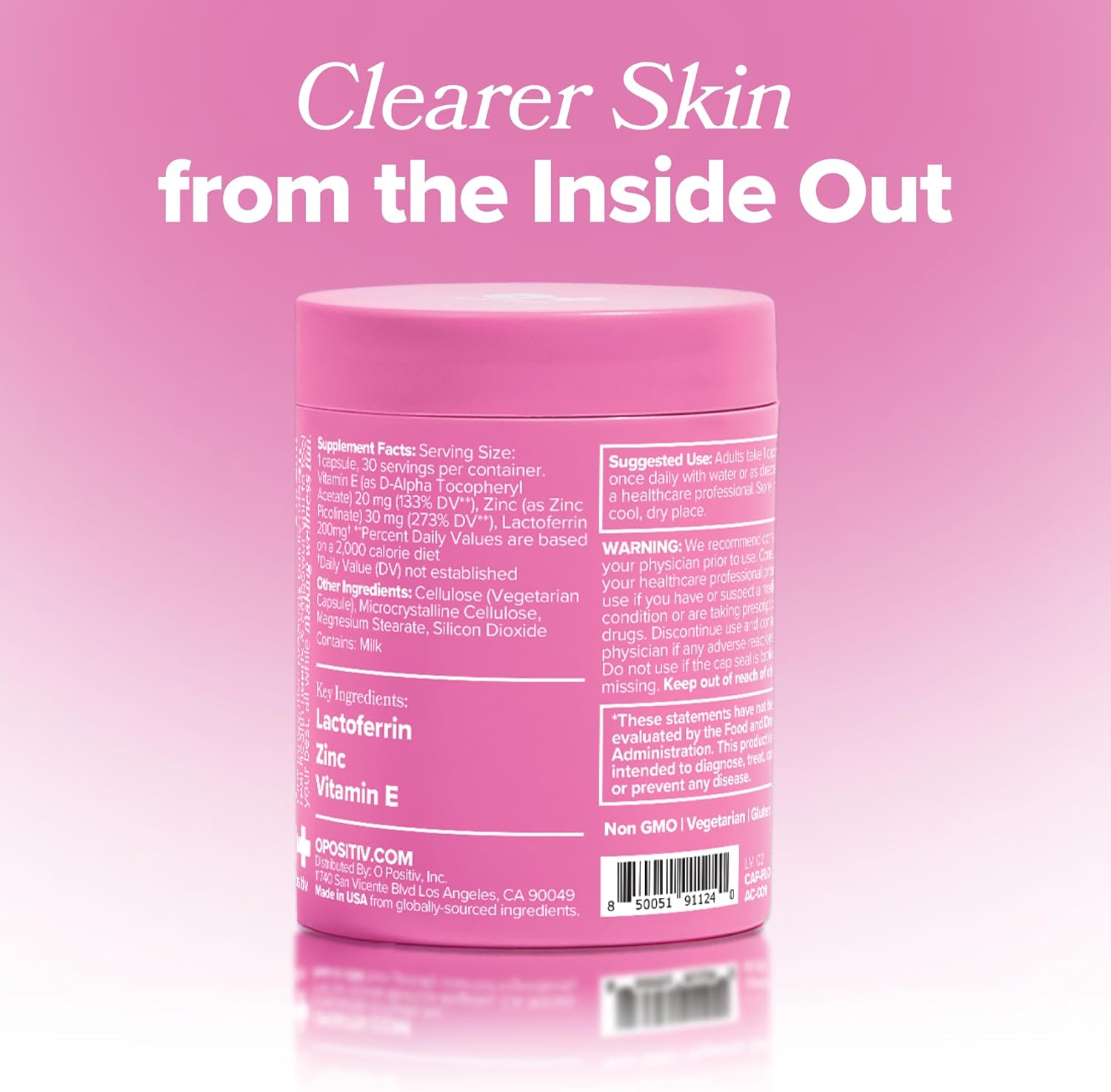 O Positiv FLO Acne Capsules – Reduce Number and Severity of Pimples, Whiteheads, Blackheads, and Pustules on Face, Back, and Body – Colostrum-Derived Lactoferrin, Zinc and Vitamin E – 30 Servings