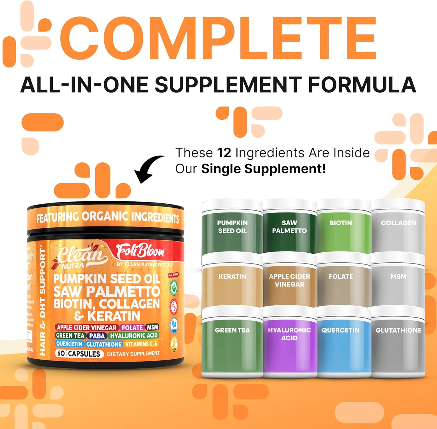 - Advanced pumpkin seed oil follicle-focused nutrition for men and women β Clean Nutra fortifies every 60-capsule bottle with premium collagen, antioxidant-rich pumpkin seed, saw palmetto, biotin, quercetin and vitamins C & E to fuel vibrant growth from root to tip. Unlike ordinary hair pills, our hyaluronic acid supplements double as scalp hydrators, while selenium and chelated zinc help strengthen follicles so strands appear visibly thicker, fuller and more resilient with each wash.