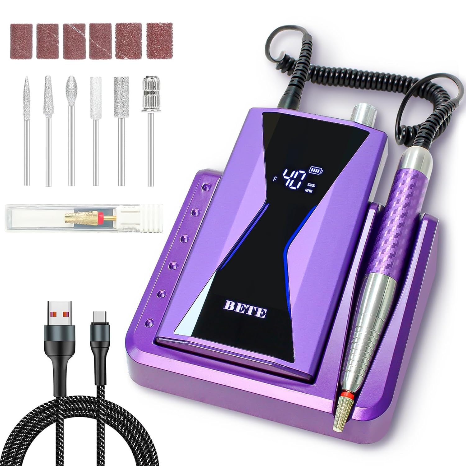 BETE Professional Nail Drill Machine, 0-40000RPM Brushless Durable Electric Nail File for Acrylic Gel Nails, Rechargeable Nail Drill with Charging Base with 6pcs Drill Bits for Salon Home, Purple